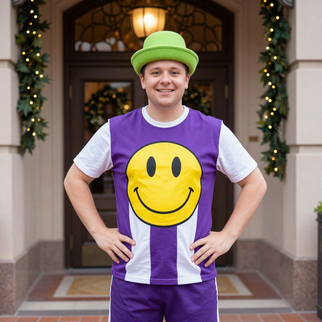 A cheerful, medium-built man in his late 20s, wearing a vibrant purple and white outfit with a large smiley face graphic on the front, and a bright green hat on his head. He is standing confidently in front of an ornate building entrance featuring a prominent door and a festive garland draped across the background.