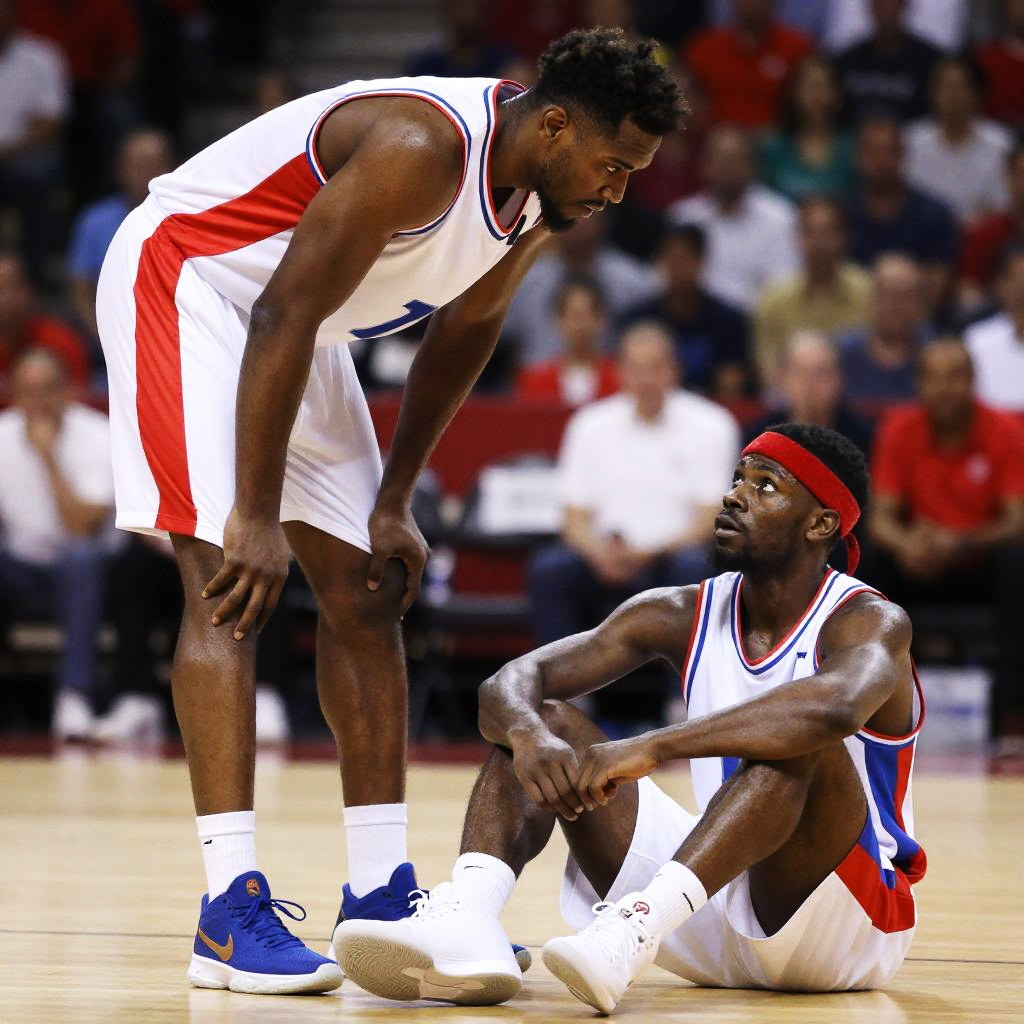 Photograph of two African American basketball players on a wooden court. Tall player with muscular build and white, red, and blue uniform crouches, hands on knees, looking down at shorter player with red headband, white, red, and blue uniform, sitting and holding white sneakers. Background shows blurred spectators. Short player's expression is attentive.