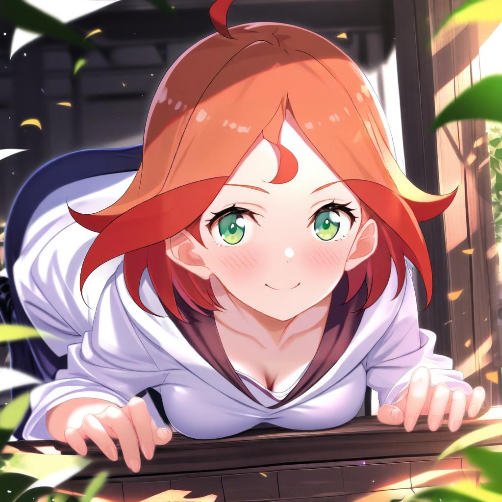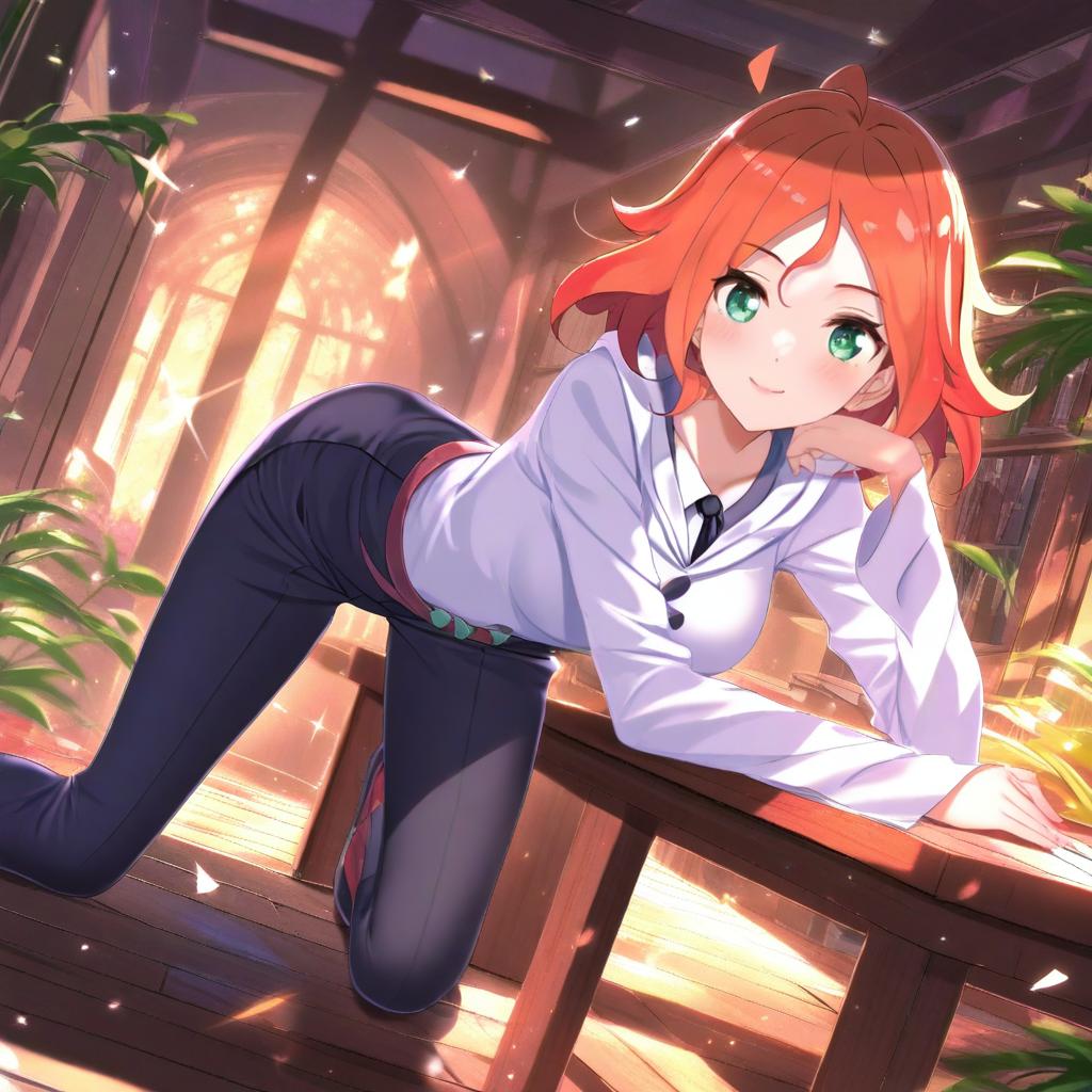 Amanda o'neill, little witch academia, 1girl, green eyes, short hair, orange hair, two-tone hair, red hair, ahoge, medium breasts, by artist swordsouls, animagine