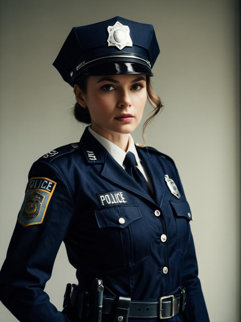 Woman in Police Costume, cinematic realism, stylish dramatic portrait --sref 1388