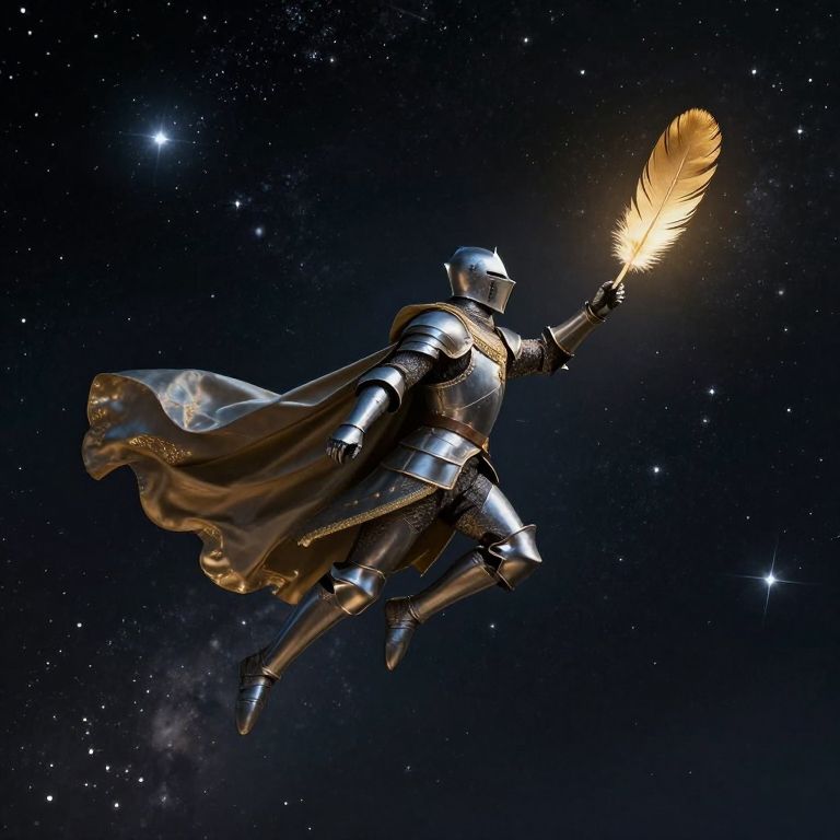 Amidst the cosmic ballet of stars and stardust, a solitary knight, cloaked in the whispers of eternity, soars through the void, guided by the ethereal weight of a golden feather—a symbol of hope and transcendence in the infinite dance of existence.