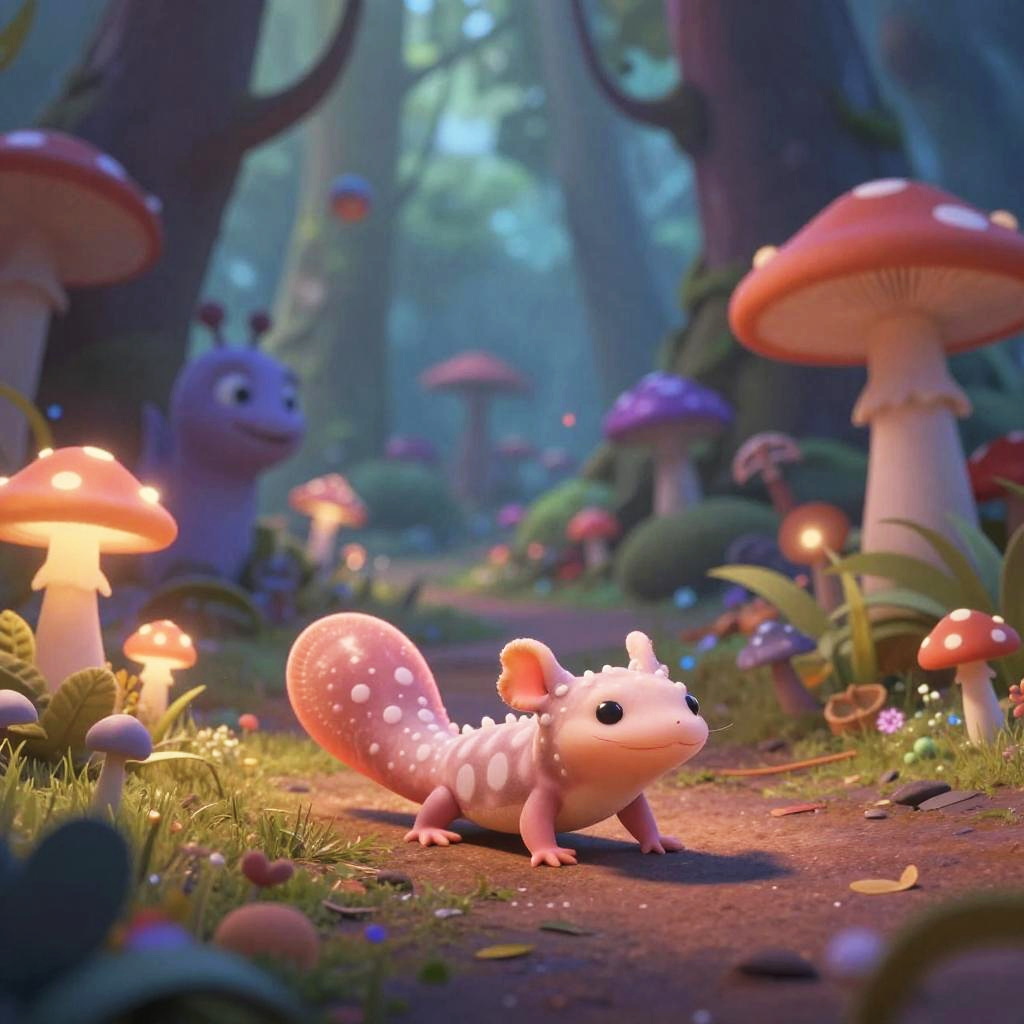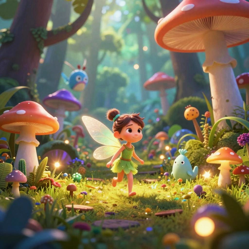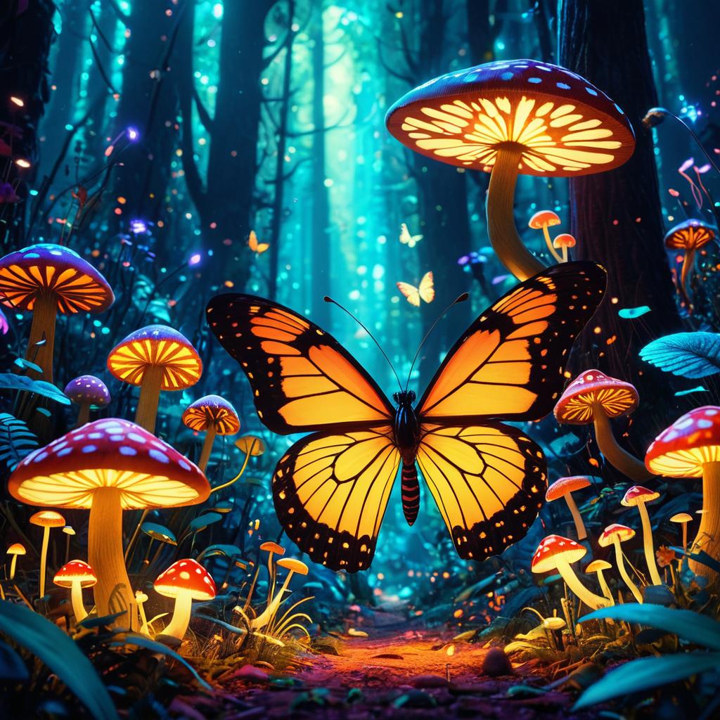 Glowing butterfly, wandering through a psychedelic forest in a Pixar 3D animation style; surrounded by glowing mushrooms, plants, and creatures, representing transformation and self-discovery, with bright, saturated colors, soft diffuse lighting, playful and warm glow
