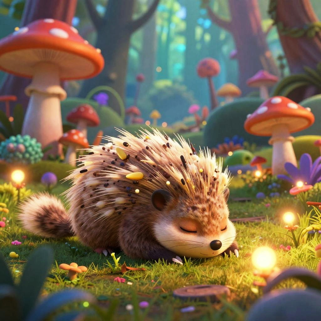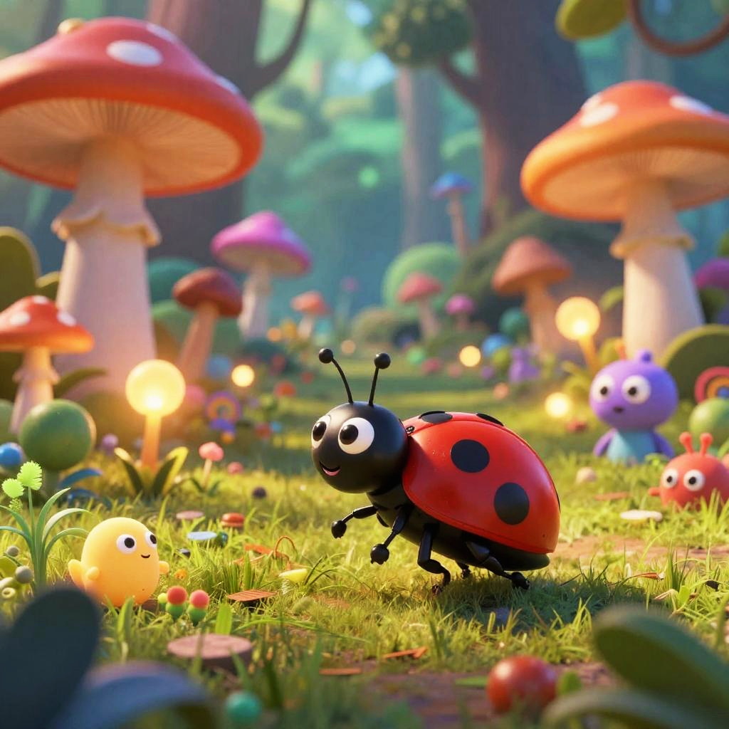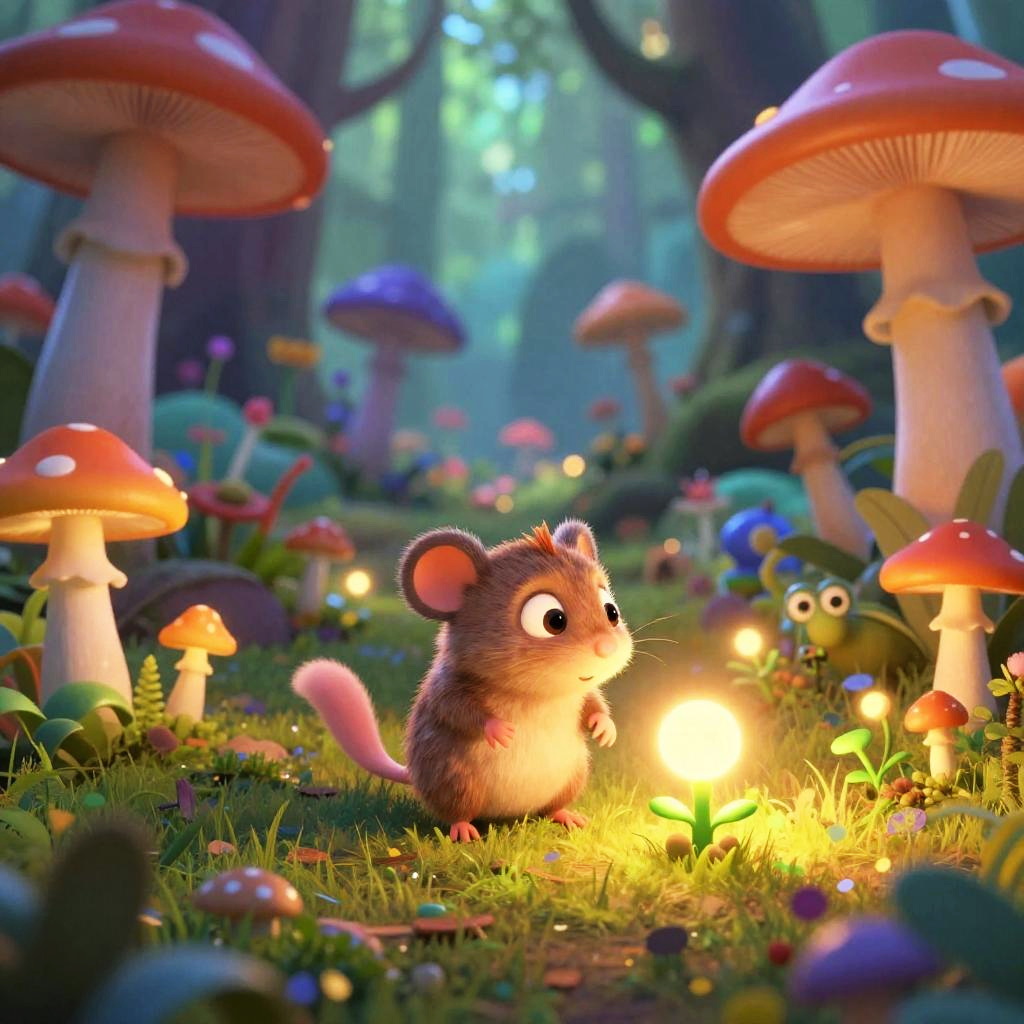 Glowing butterfly, wandering through a psychedelic forest in a Pixar 3D animation style; surrounded by glowing mushrooms, plants, and creatures, representing transformation and self-discovery, with bright, saturated colors, soft diffuse lighting, playful and warm glow
