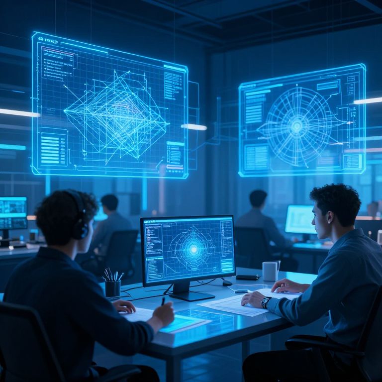 A photograph of a high-tech, blue-lit office workspace with two men seated at desks, focusing on digital blue holographic interfaces displaying intricate, glowing geometric patterns. The men, dressed in dark business attire, use laptops and notebooks. The background shows blurred figures working at their desks, illuminated by soft, blue ambient lighting. The holographic screens float in the air, casting a futuristic glow. The overall scene exudes a high-tech, futuristic atmosphere with a strong blue color palette.