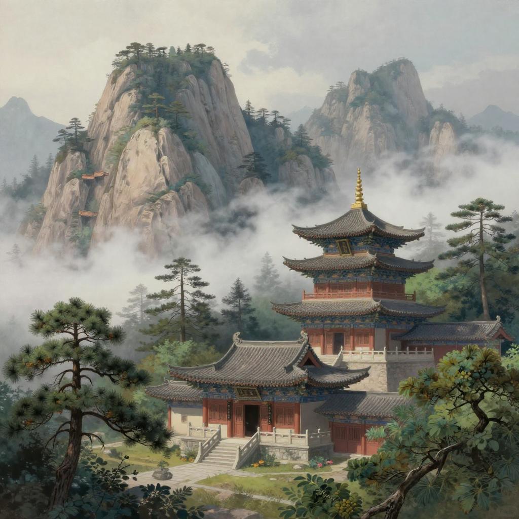 A serene painting of a mountain monastery and pagoda nestled among pine trees in a misty forest. The scene features towering rugged mountains in the background with soft clouds and mist rolling through the landscape. The architecture is traditional East Asian style with multi-tiered pagoda roofs and intricate details. Lush greenery surrounds the buildings, evoking a peaceful and spiritual atmosphere.