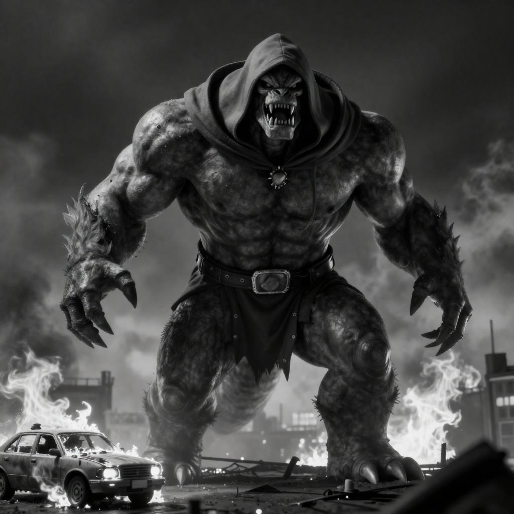 Black-and-white photograph of a massive, muscular monster with sharp teeth and a hooded cloak, standing on a rooftop. Flames and smoke rise in the background. A burning car is on the left. Dark, intense atmosphere. Monster's right arm raised.