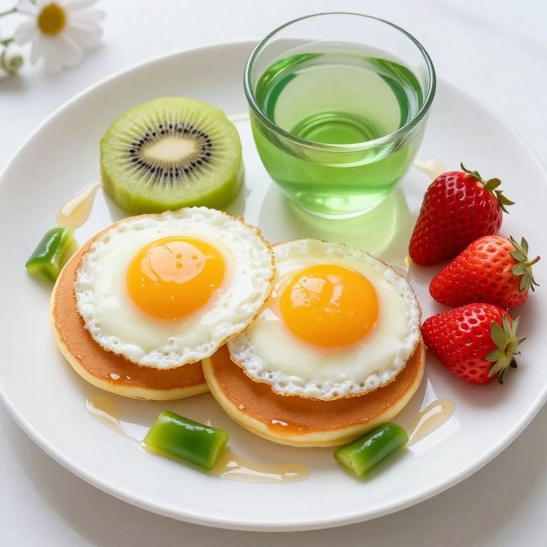 Creative breakfast presentation featuring two sunny-side-up eggs atop golden pancakes, garnished with a kiwi slice and green bell pepper pieces, accompanied by fresh strawberries and a side of green tea, all arranged on a white plate with syrup drizzled around.