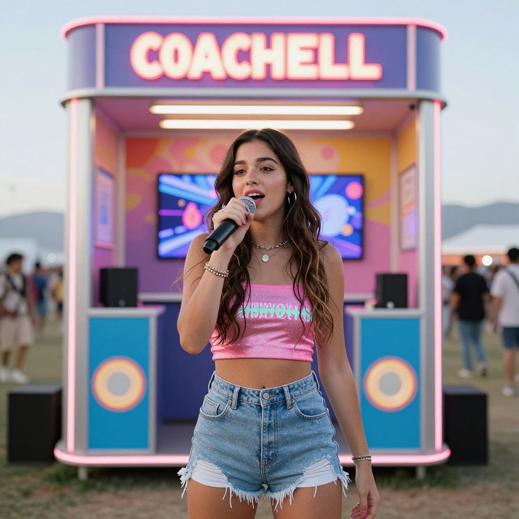 Photograph of a young woman with long, wavy brown hair singing into a microphone at a brightly lit, retro-style food truck named "COACHELL" in neon pink letters. She wears a pink crop top with "COACHELL" in white letters, and high-waisted, frayed denim shorts. The food truck has a colorful, circular design with orange and blue accents and a large screen displaying a blurred image. The background shows a grassy field with a few people and a blurred, cloudy sky at dusk. The woman has a fair skin tone, a slim build, and a confident expression.