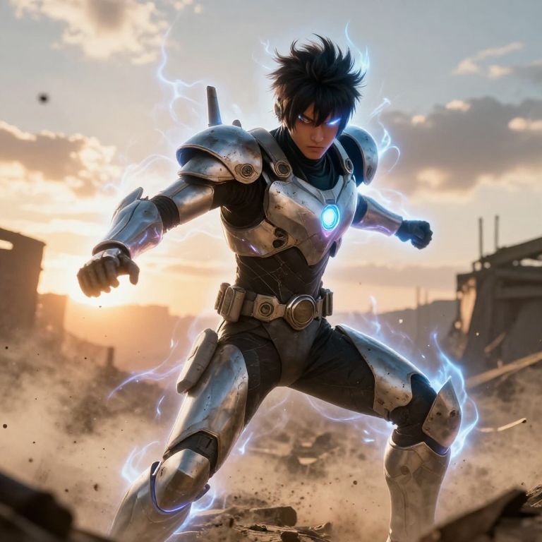 Epic henshin shot in a post-apocalyptic landscape, glowing energy aura surrounding the hero mid-transformation, worn but advanced battle armor materializing, dust and debris swirling, intense focus and determination on the face, dramatic sunset lighting.