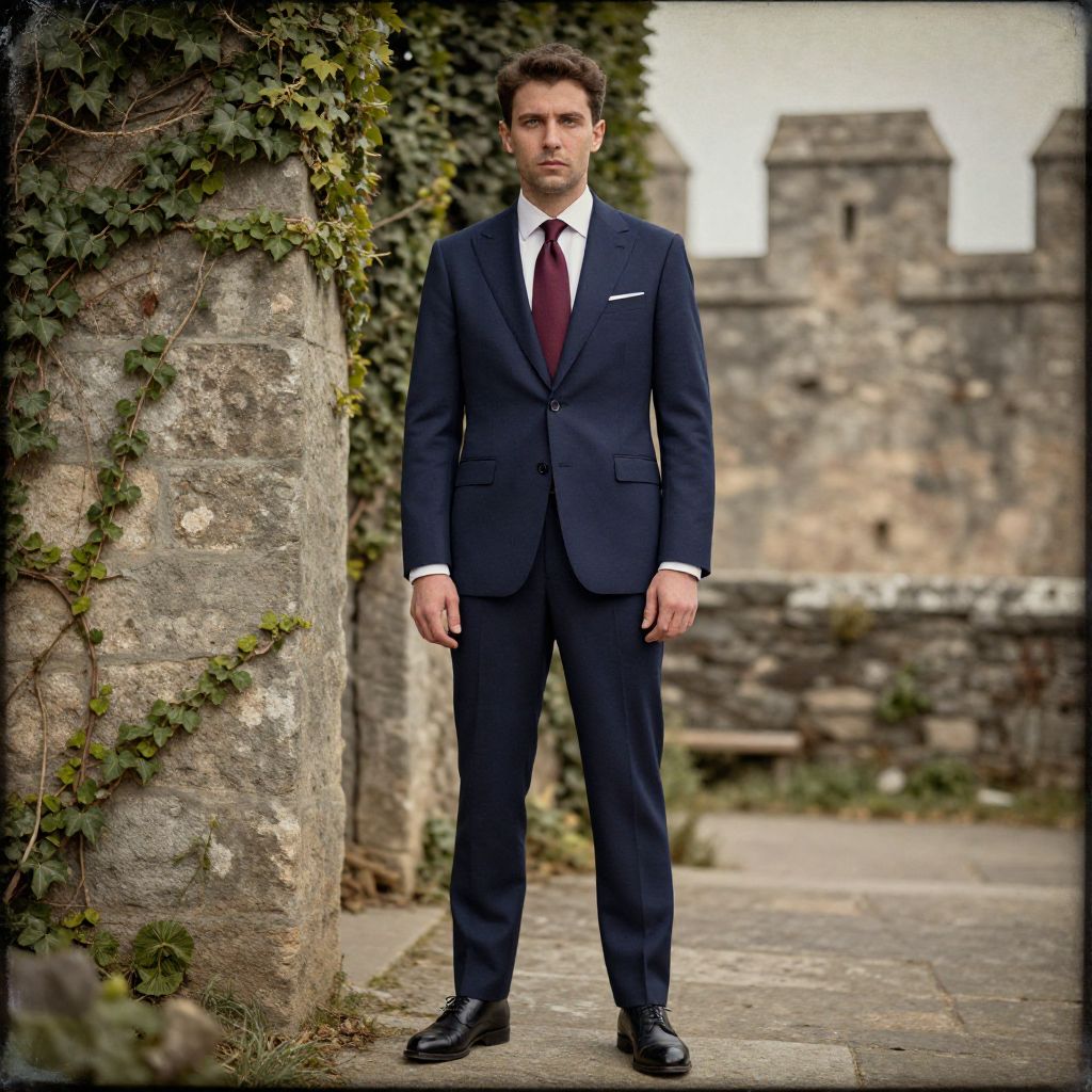 A man, navy blue tailored suit, crisp white dress shirt, deep burgundy silk tie, polished black leather oxford shoes, ancient stone walls, overgrown ivy, crumbling battlements, collodion wet plate style, confident expression Man has masculine face and piercing eyes
