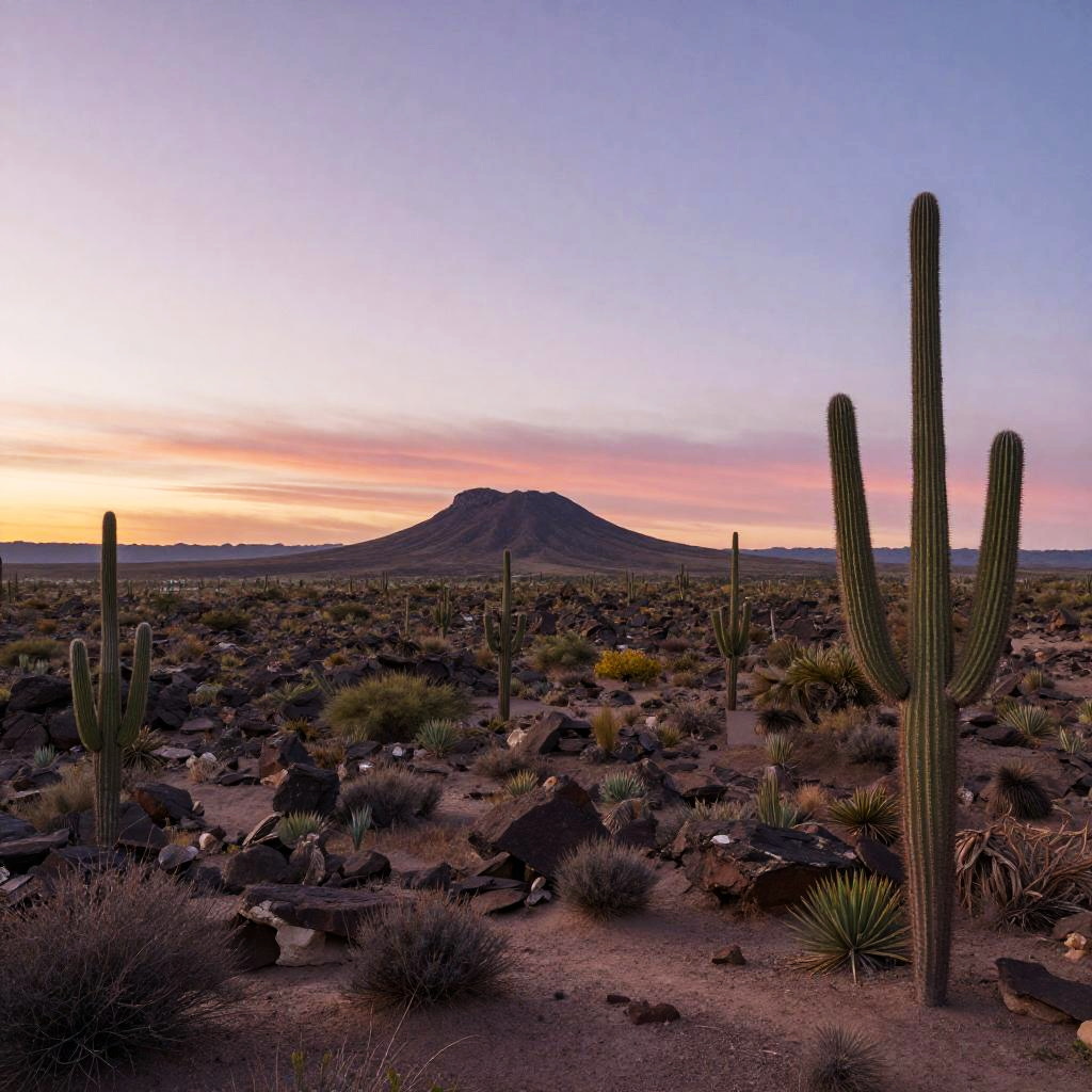 Latin America landscape during sunset with sweeping deserts and cacti, soft pastel skies, rugged terrain, tranquil atmosphere, high detail, vibrant natural hues