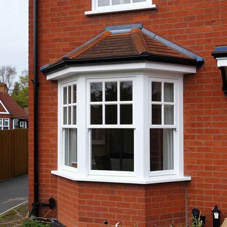 Replacement bay windows installed on a red brick house in Bedfordshire, featuring a white-framed multi-pane design with a tiled roof and black trim, set against a backdrop of suburban scenery including trees and neighboring houses.