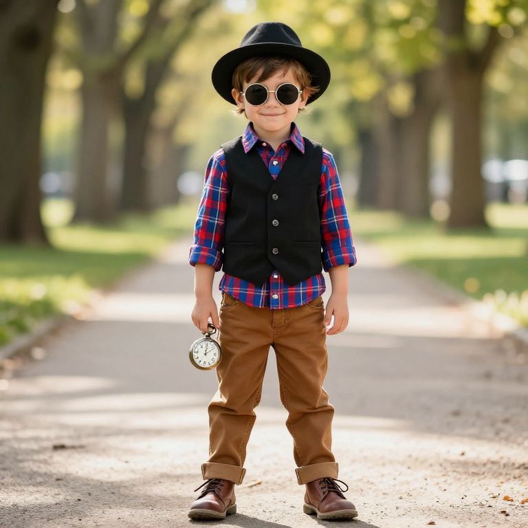 A young boy with messy brown hair and a mischievous smile stands in a sunlit backyard, wearing a black hat adorned with a detailed skull design, a beige button-up shirt with a slightly undone collar, black suspenders with small metal clips, and a vibrant orange scarf tied neatly around his neck. He holds a small wooden toy in one hand and looks directly at the camera with curious eyes, blending a rebellious yet endearing vibe in a cozy, nature-filled setting.