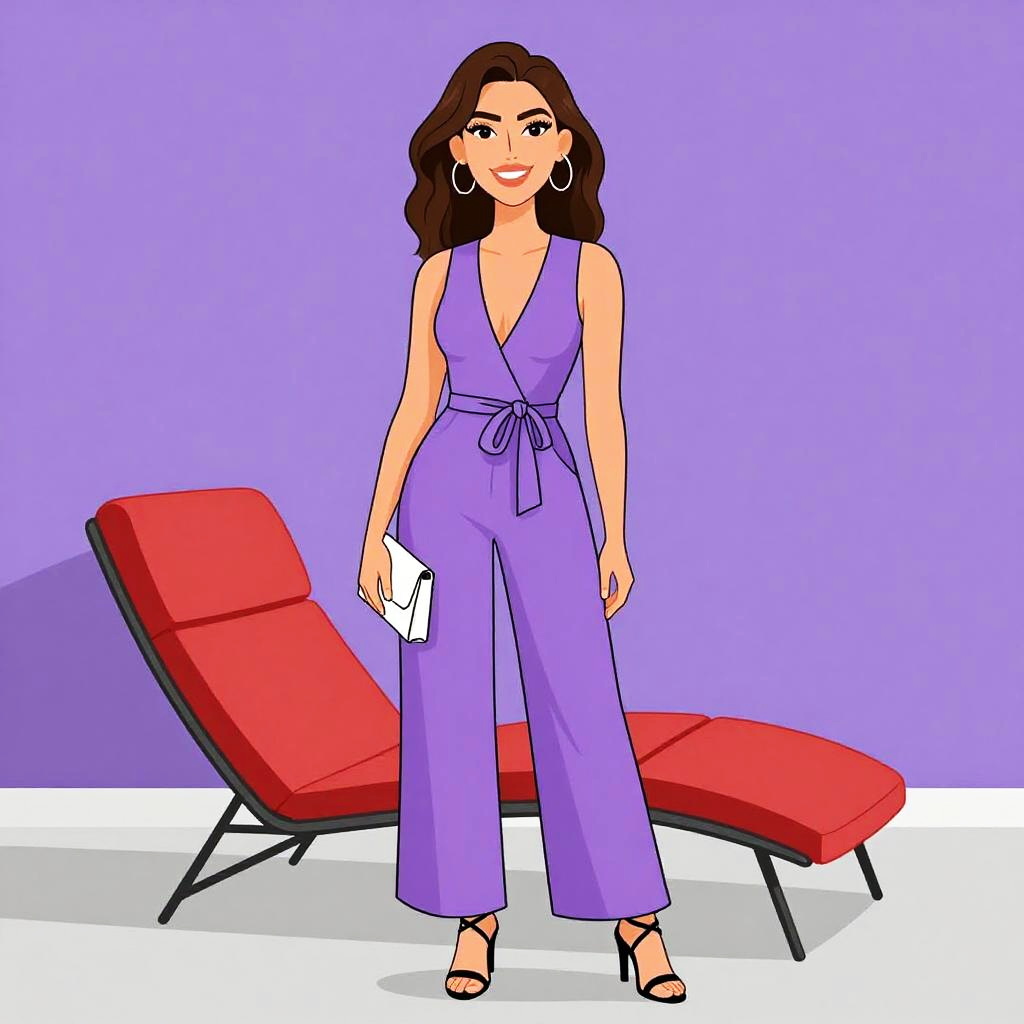 Digital illustration of a smiling woman with long brown hair in a peach long-sleeve jumpsuit, holding a small white purse, standing in a minimalist