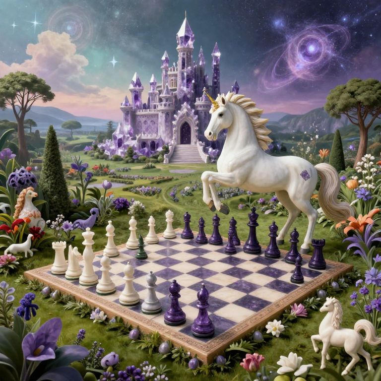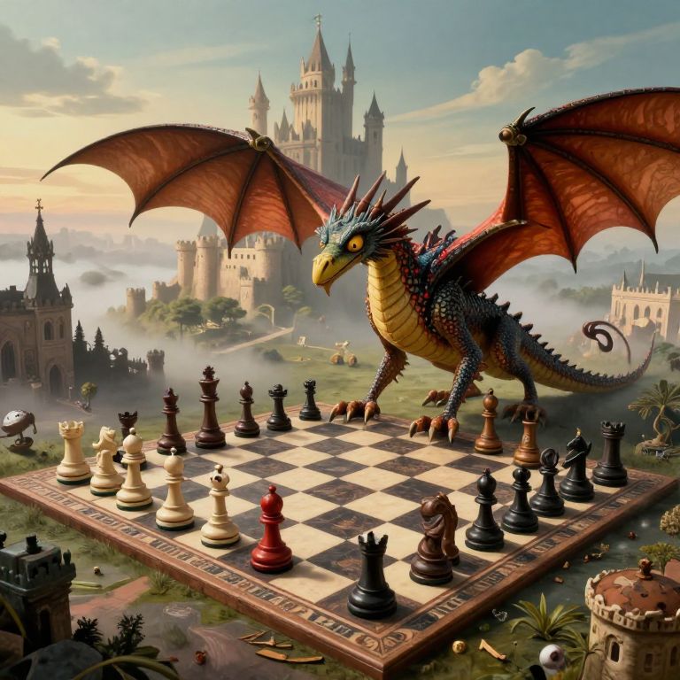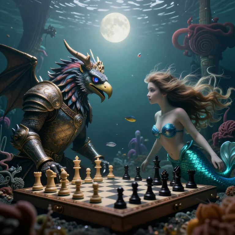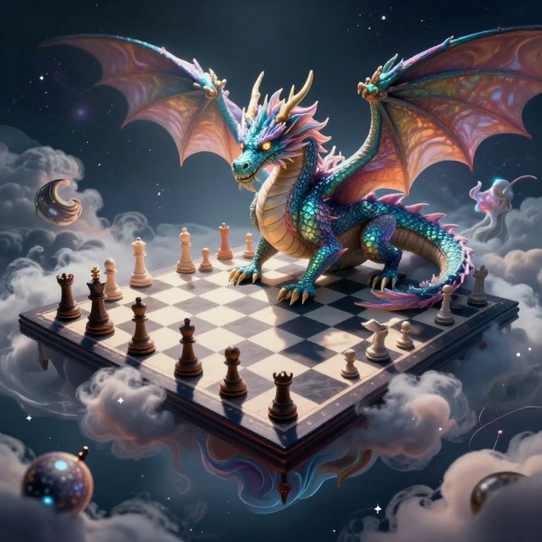 Imagine a surreal chessboard stretched across an expansive sky veiled in clouds, where fantastical elements like melting hourglasses and floating archipelagos intertwine with the powerful intensity of superheroes locked in epic battle. Ethereal knights and mysterious queens, embodying figures from ancient mythology, engage in a grand showdown against the backdrop of this dreamlike landscape. Captured from a dramatic low-angle perspective, the scene evokes both awe and mystery as shifting shadows from celestial bodies hidden behind swirling clouds create an emotional gradient that heightens the tension between these mythical combatants.