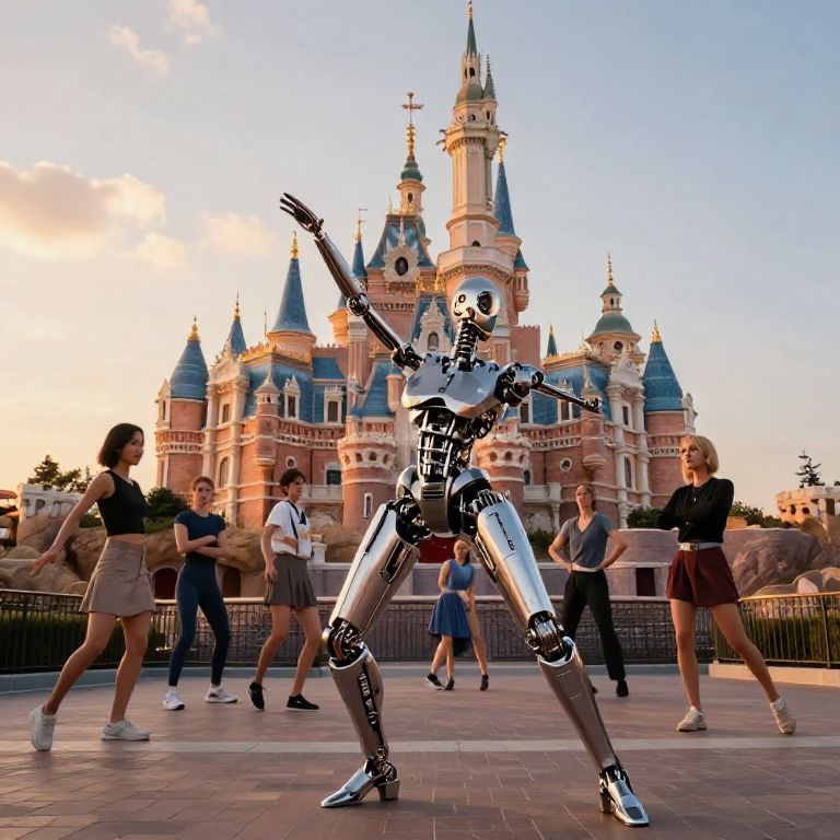 Mechanical seven of nine jeri ryan, dynamic pose, dancing, cinematic lighting, shot by ARRI, sunset, visiting disney world, ultra-realistic, highly detailed, sharp image, 35mm, Nikon,