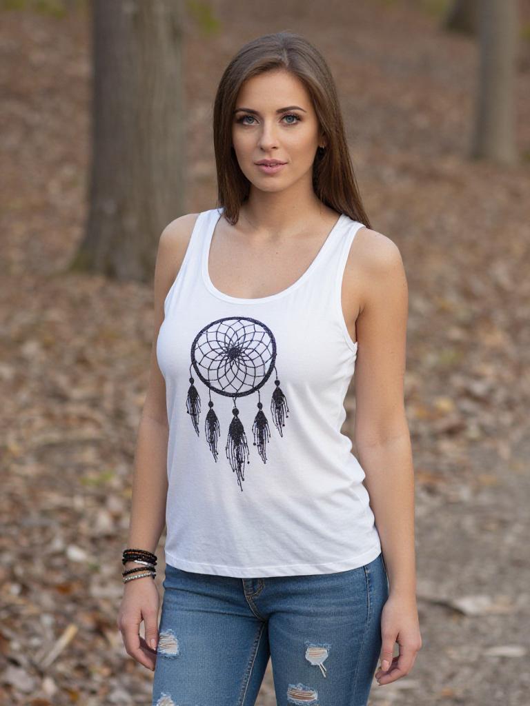 Photograph of a young woman with straight brown hair, wearing a white tank top with a dreamcatcher design, blue distressed jeans, and black bracelets