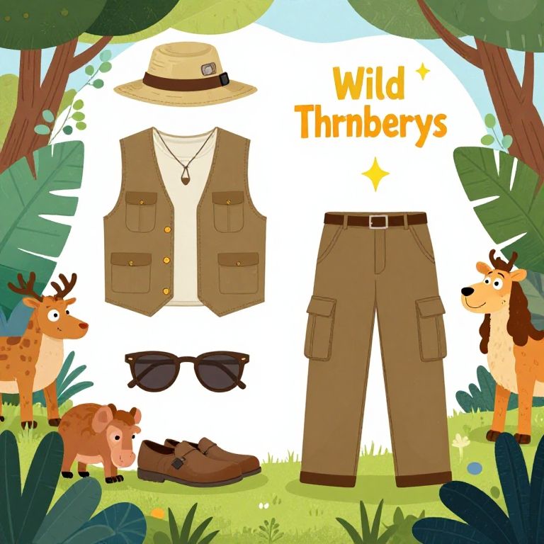 Illustrate a Wild Thornberrys costume concept including detailed clothing elements like the safari hat, vest, and cargo pants, combined with a backdrop of wild animals and dense greenery, capturing the adventurous essence with a bright and playful color palette.