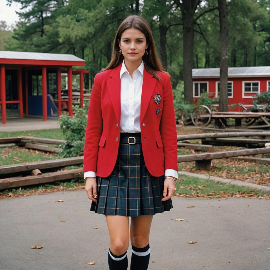 Photo of a Brawny woman, Layered Cut, rebelde outfit, preppy school uniform with a Royal Red Wool-silk blend blazer, white shirt, black tie, plaid skirt, knee-high socks, Running Trainers, early 2000s fashion, youthful, rebellious, Latin American pop culture, Abandon Theme Park, bold chromatic composition