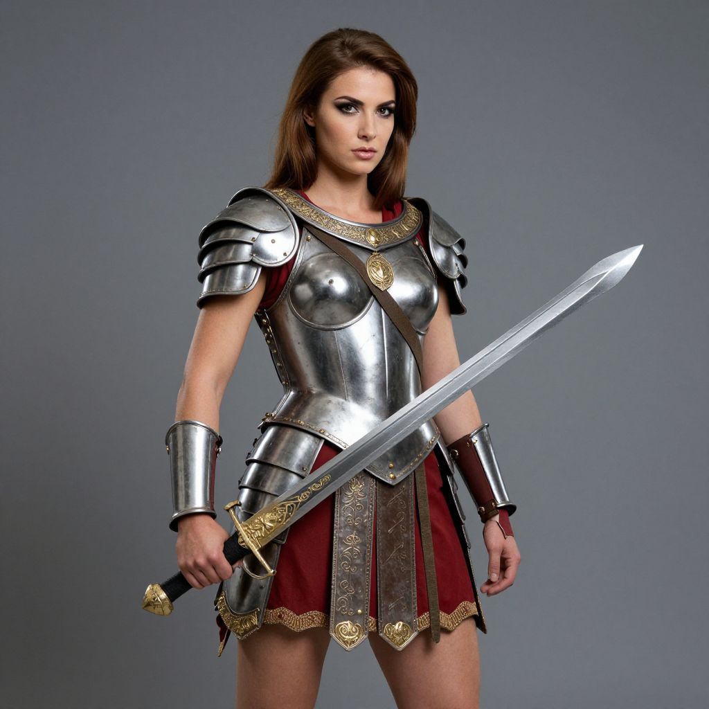 Female roman gladiator costume, woman in armor holding a sword and a sword