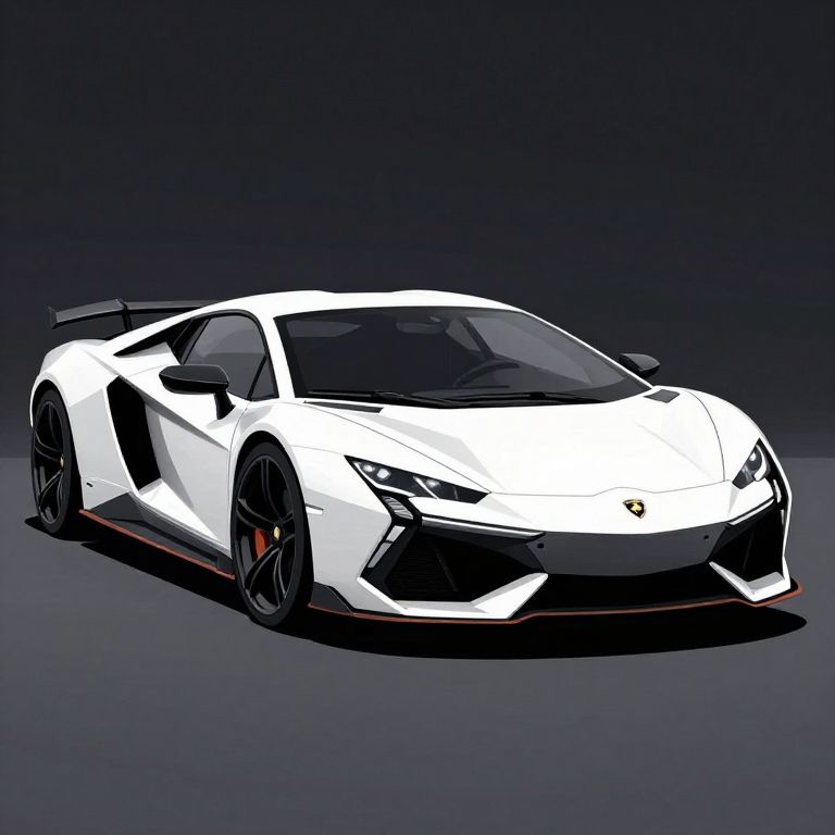 Digital illustration of a sleek, white Lamborghini Aventador with black accents, red brake calipers, and sharp angular lines, set against a dark