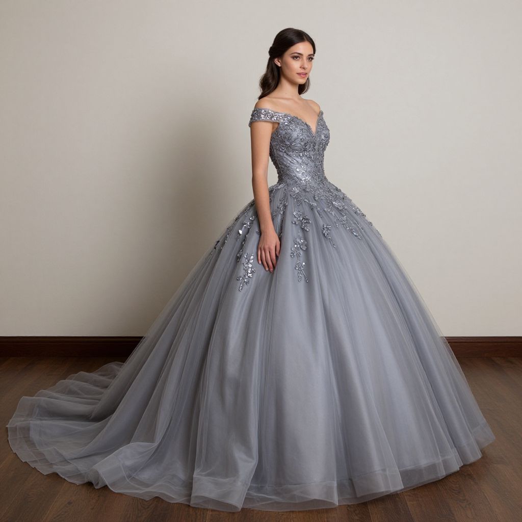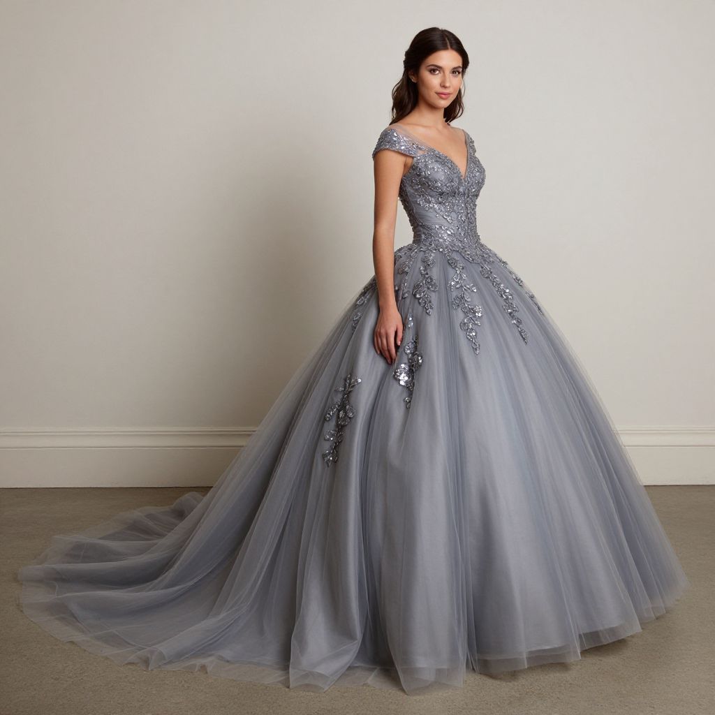 Elegant woman standing against a plain wall, wearing a custom-made gray tulle quinceañera dress adorned with floral sequin embellishments and a flowing skirt that cascades gracefully to the ground.