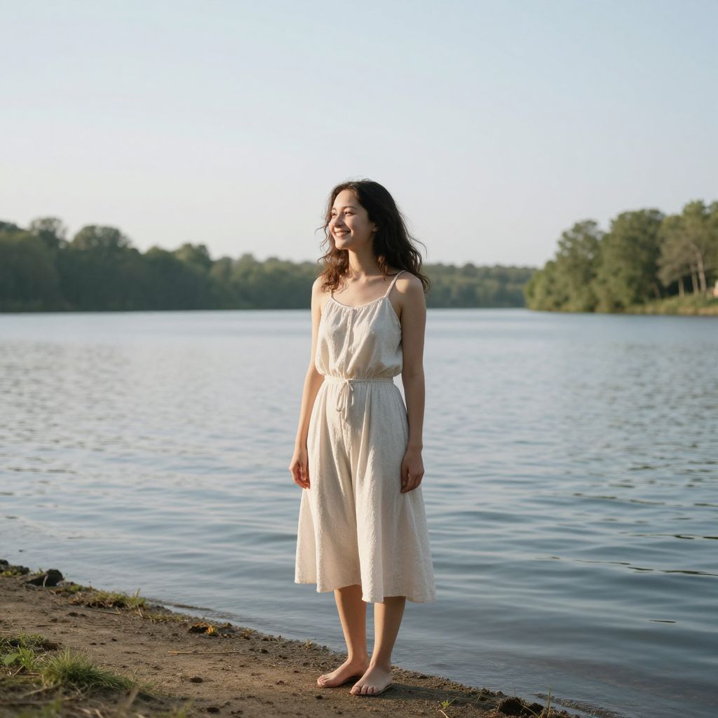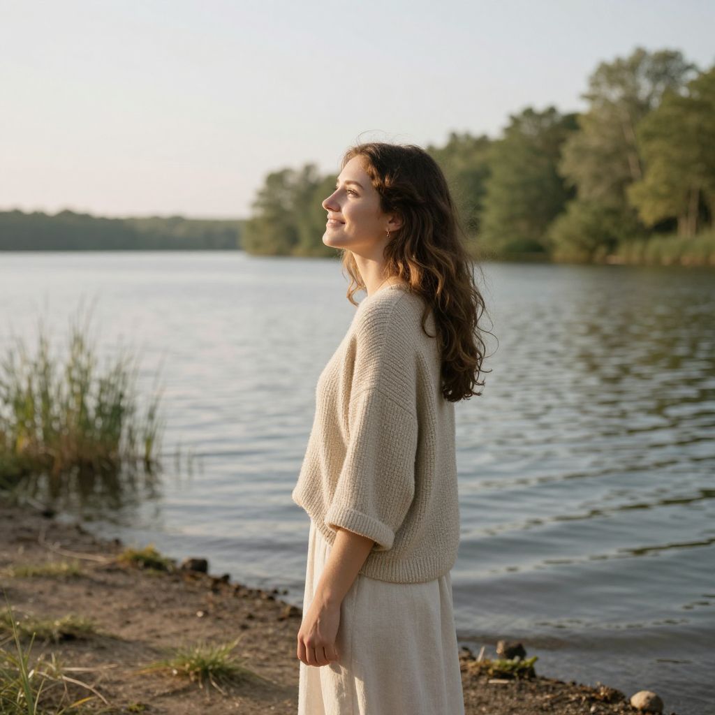 Photograph of a young woman with long, wavy brown hair standing by a serene lake. She is facing right, wearing a loose, beige knit sweater and a white skirt. The sunlight casts a warm glow on her face, highlighting her calm expression. The background features a calm lake with gentle ripples, surrounded by lush green trees and a grassy shore. The sky is clear and blue, suggesting a peaceful, late afternoon setting. Her relaxed posture and natural surroundings evoke a sense of tranquility and connection with nature.