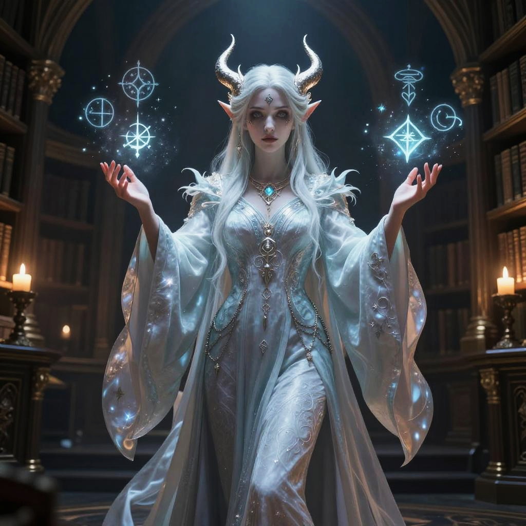 Digital art of a white-haired, horned, ethereal elf woman in a glowing white robe, casting magical symbols in a dark, candlelit library