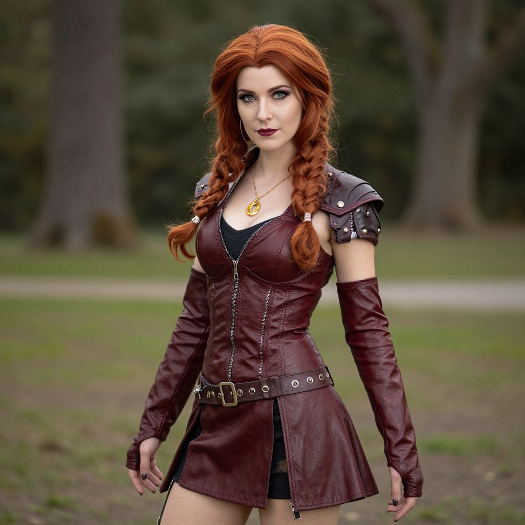 "Triss Merigold Cosplay, woman with red hair and a leather outfit posing for a picture"