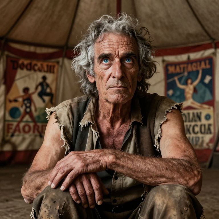 Envision a captivating photorealistic portrait of an experienced circus performer, their calloused hands resting on weathered knees, eyes fixed pensively into the distance as if lost in a world of memories. The subject's face, etched with deep lines and softly illuminated by side lighting, casts subtle shadows across craggy features, drawing attention to intense blue eyes that seem to hold an entire lifetime of stories. Framed by wild graying hair, this portrait embodies resilience and adventure, set against the backdrop of a vintage sepia-toned circus tent adorned with vibrant yet faded posters advertising daring acrobatics and thrilling acts. From an overhead perspective, focus on the intricate details—frayed clothing edges and the complex interplay of light and shadow across their face—evoking a sense of awe for the remarkable life experiences captured within this image.