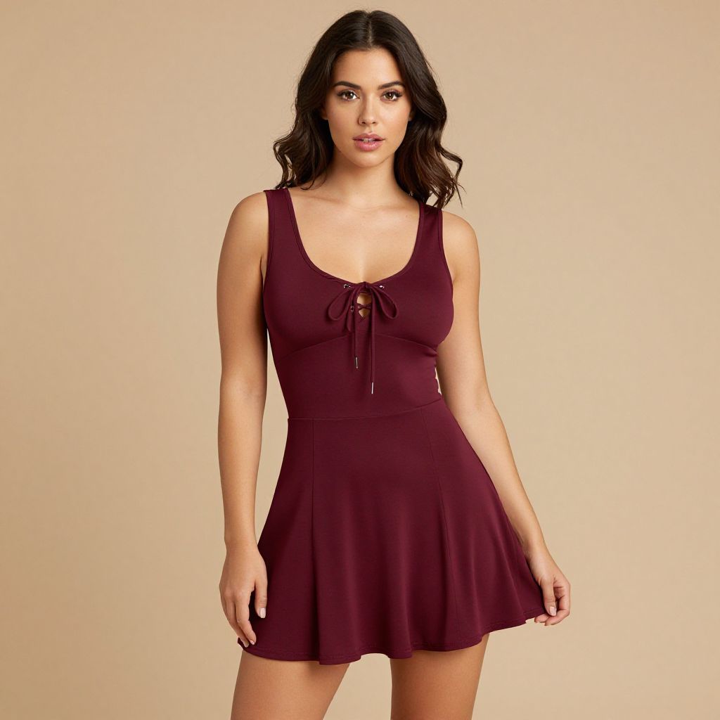 "Woman, girly style, burgundy skater dress, sleeveless, lace-up detail on the bodice, scoop neckline, flared skirt, mini length, subtle pleats.. Sexy. Pretty face and beаutiful eyes. Big breasts."