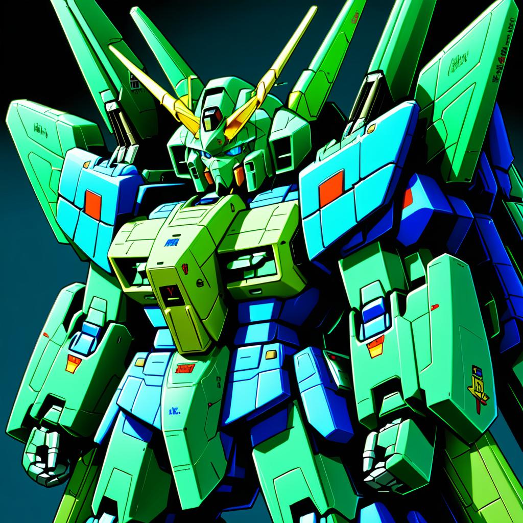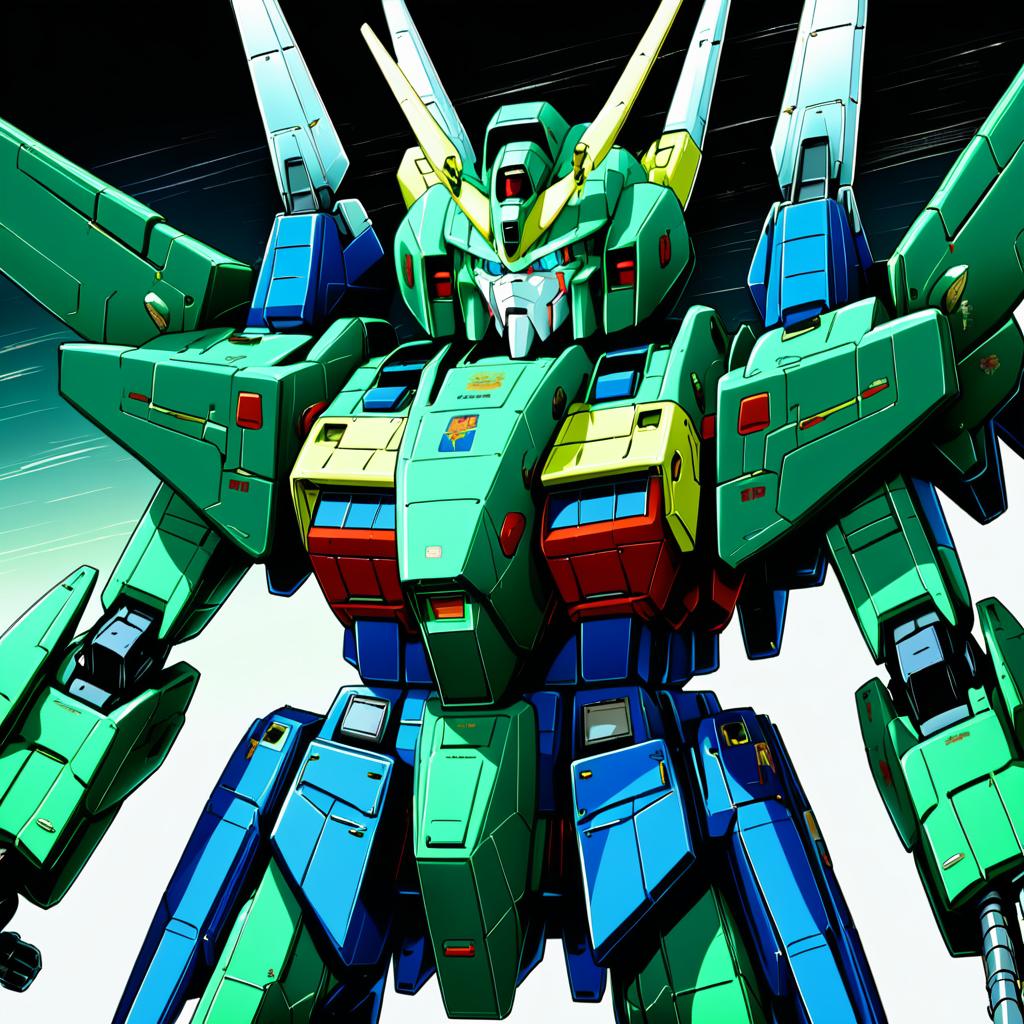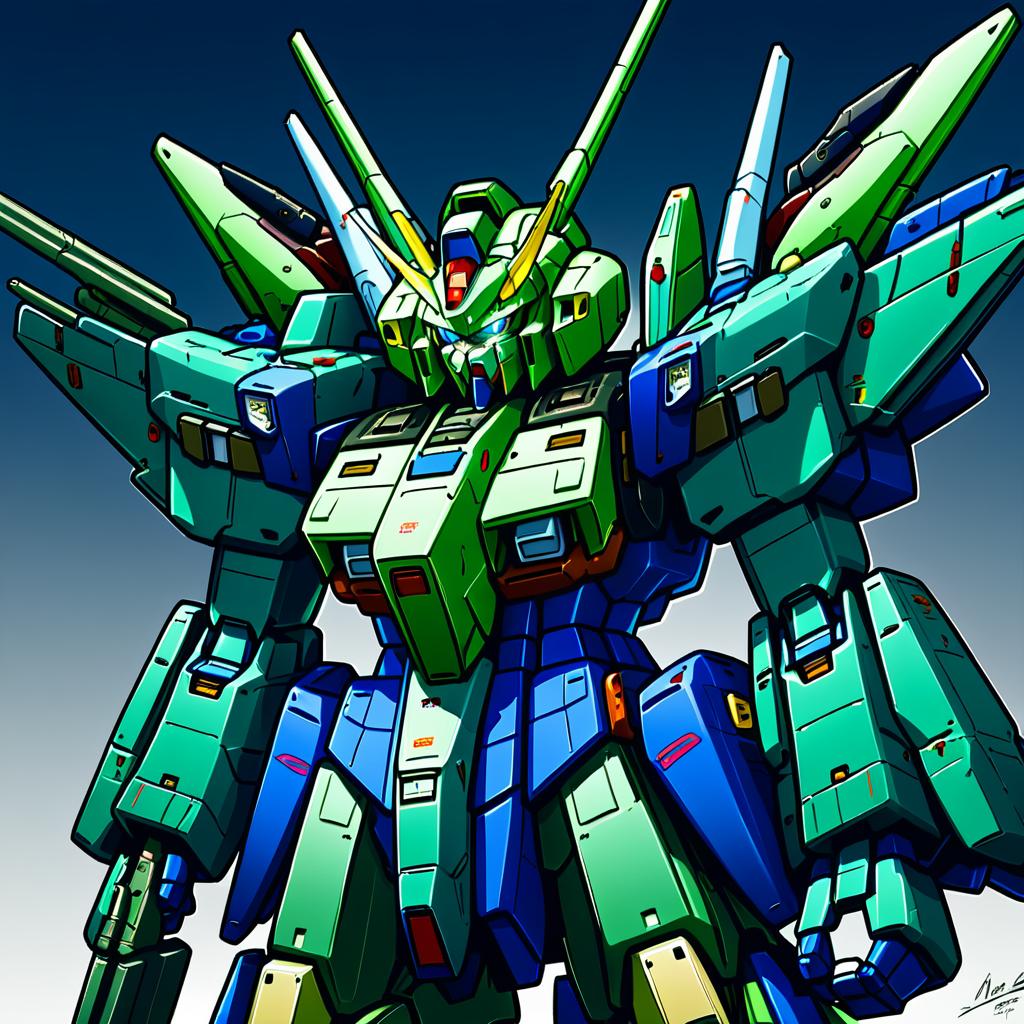 Detailed illustration of Gundam MK II, a mobile suit mecha robot characterized by its blue, green, and yellow armor. The robot features prominent V-fin antennas on its head, multiple colored panels, and mechanical limbs, depicted in a bold and vibrant anime art style inspired by artist pun2.