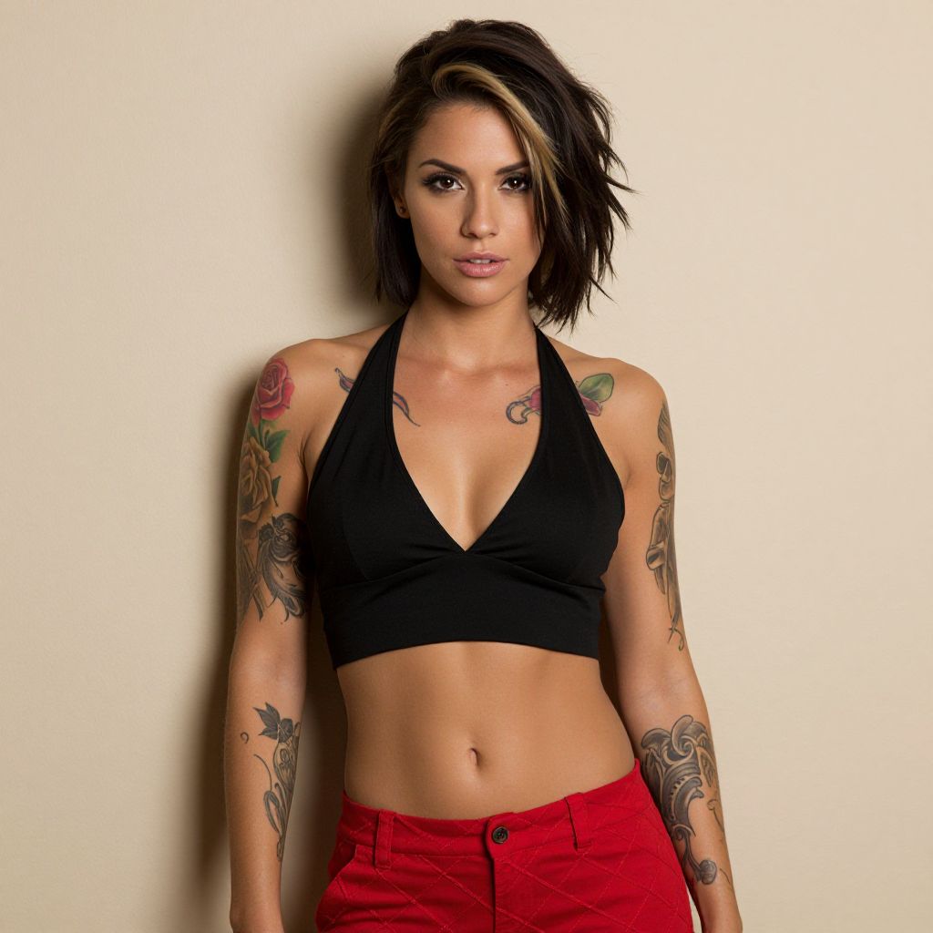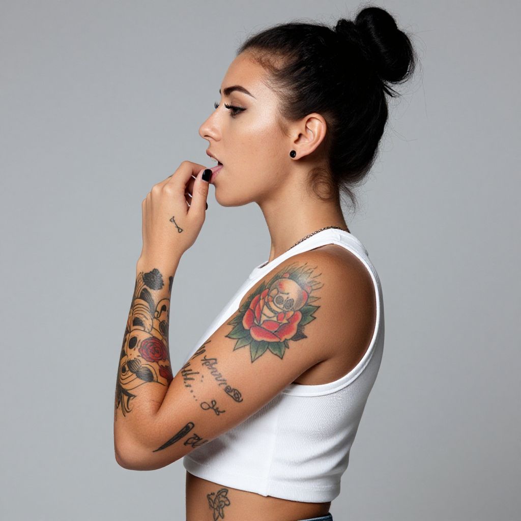 Photograph of a tattooed woman with light brown skin and dark hair in a bun, standing side profile against a gray background. She's wearing a white cropped top and has colorful tattoos on her arms, including a rose, skull, and script on her hand. She's biting her black-painted finger, showing off her ear gauges and confident look.