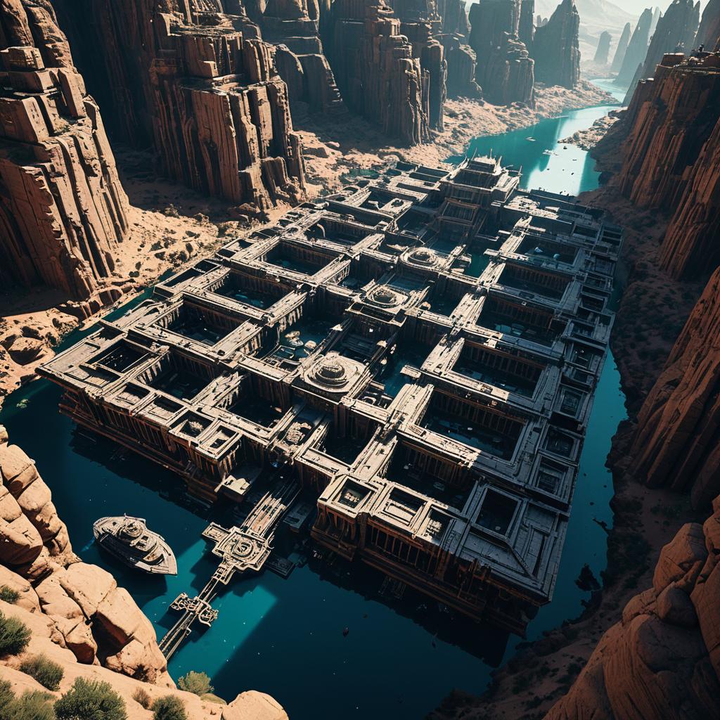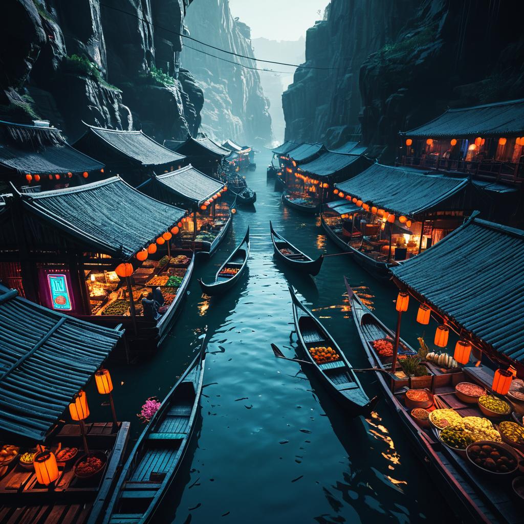 Overhead view of an ancient floating market nestled in the misty canyons of Eloria. Traditional wooden boats and covered market stalls line the narrow waterway under dramatic lighting, with glowing lanterns and neon accents in a cyberpunk noir style. The scene features detailed textures and sharp contrasts, rendered in Unreal Engine 5 in an anime key art style inspired by Greg Rutkowski.