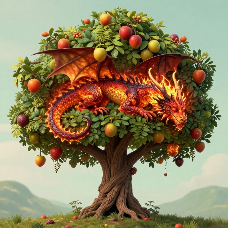In a realm where nature defies gravity, a tree adorned with vibrant fruit cradles the fiery dreams of a slumbering dragon, symbolizing the delicate balance between creation and destruction, serenity, and the untamed forces of life.