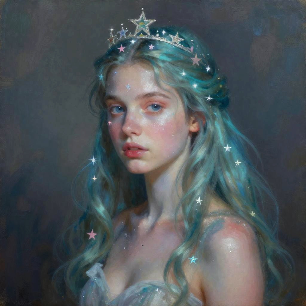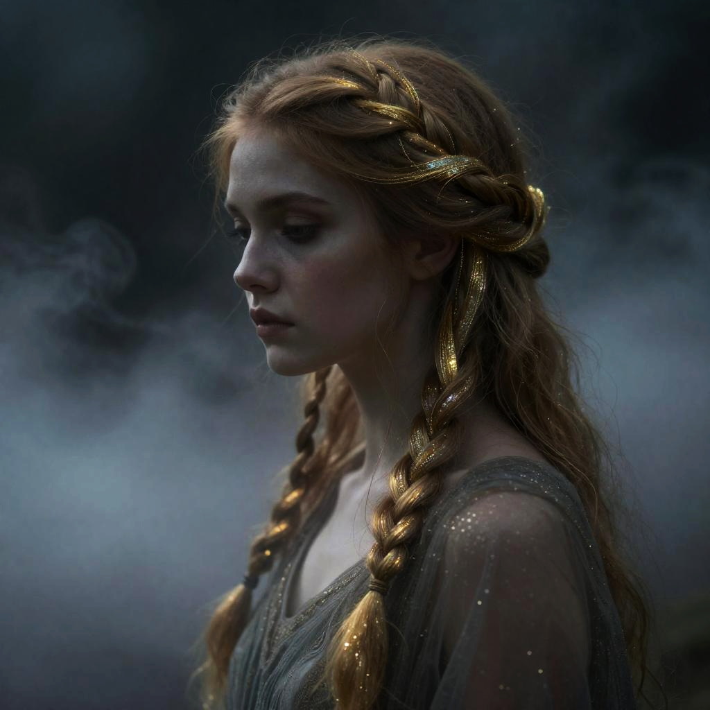 Realistic photo.A hauntingly beautiful female frost fae surrounded by fog and smoke, her hair braided threads of gold. Inspired by Eyvind Earle, Alphonse Mucha. Acrylic painting with soft illumination, intricate details, and iridescent highlights. realistic photo
