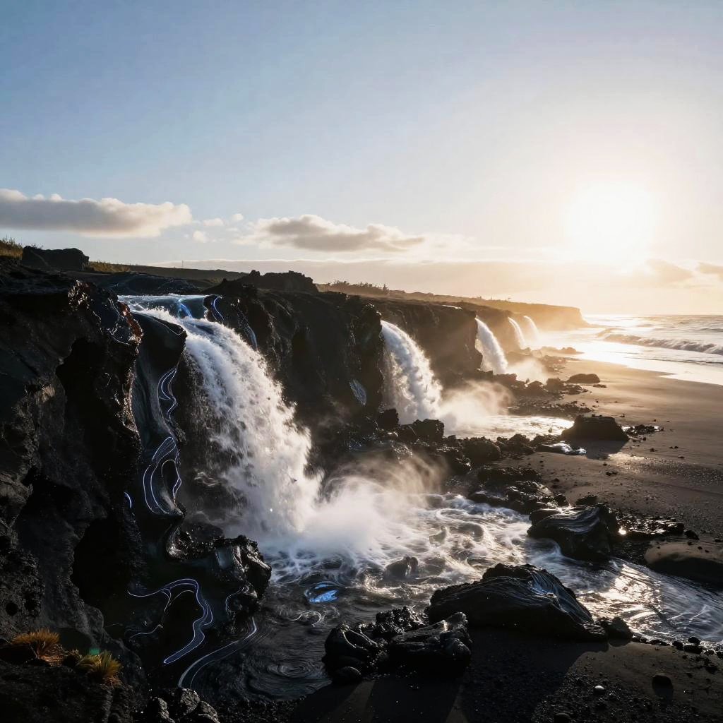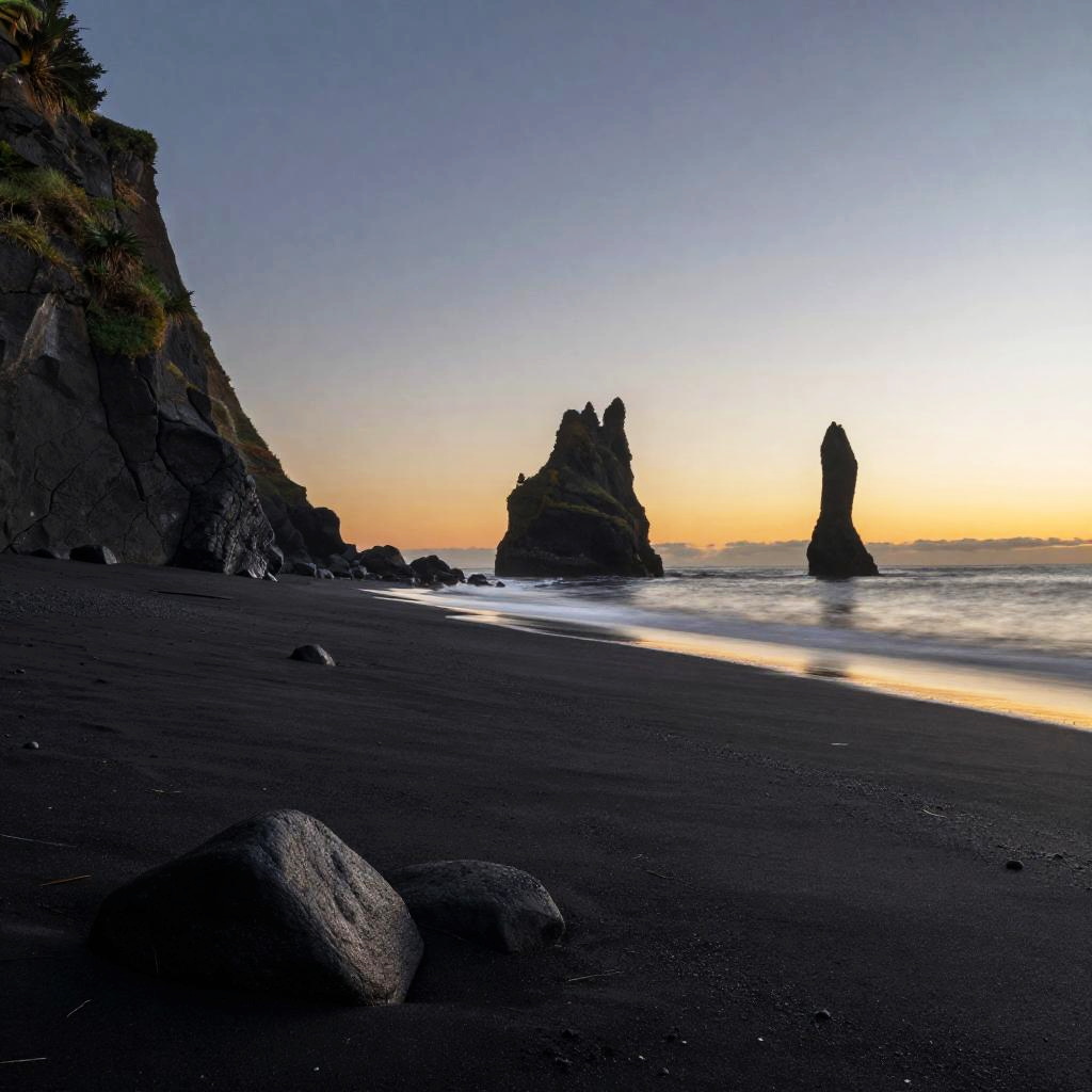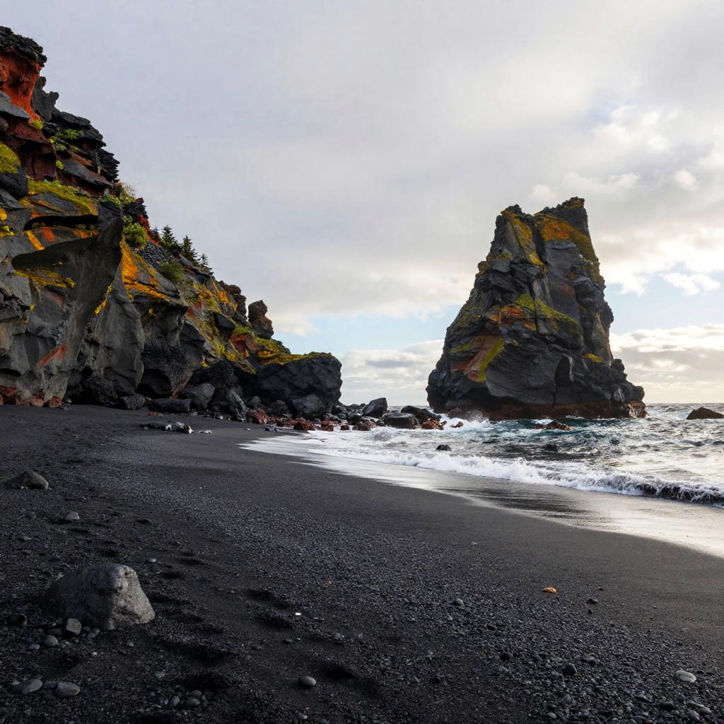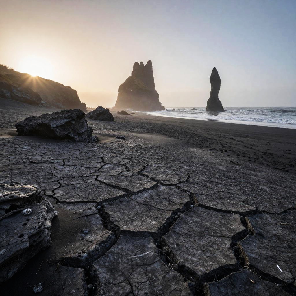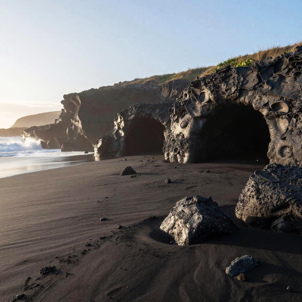 Black Sand Beaches, lava spires, crisp clear skies, midday, Surrealistic – dreamlike and exaggerated forms