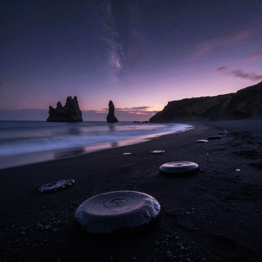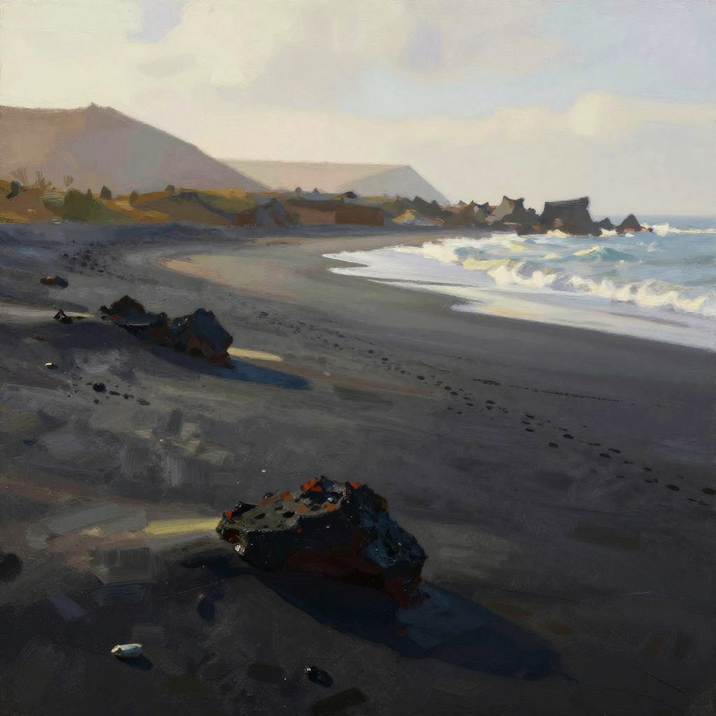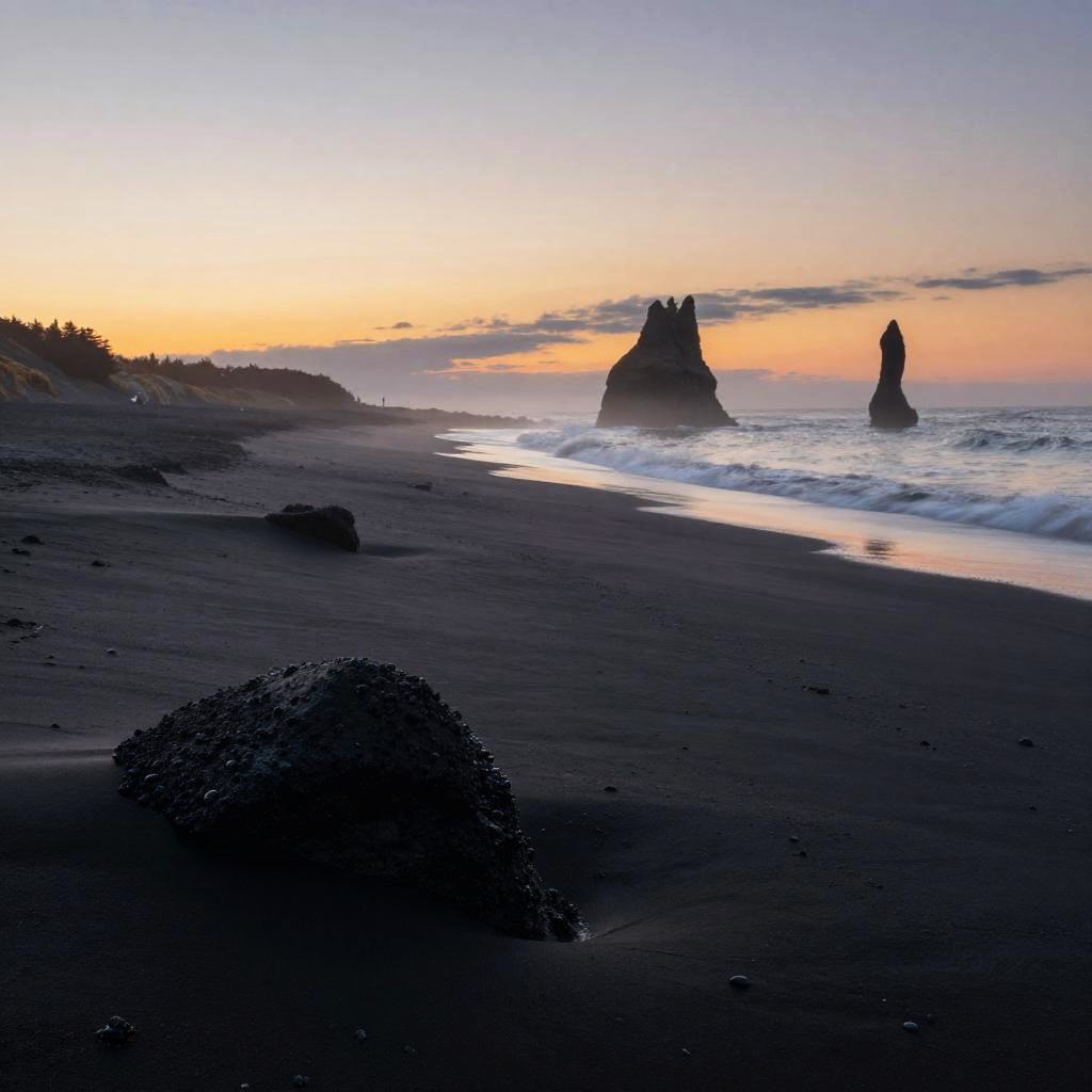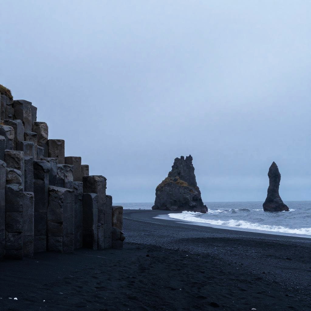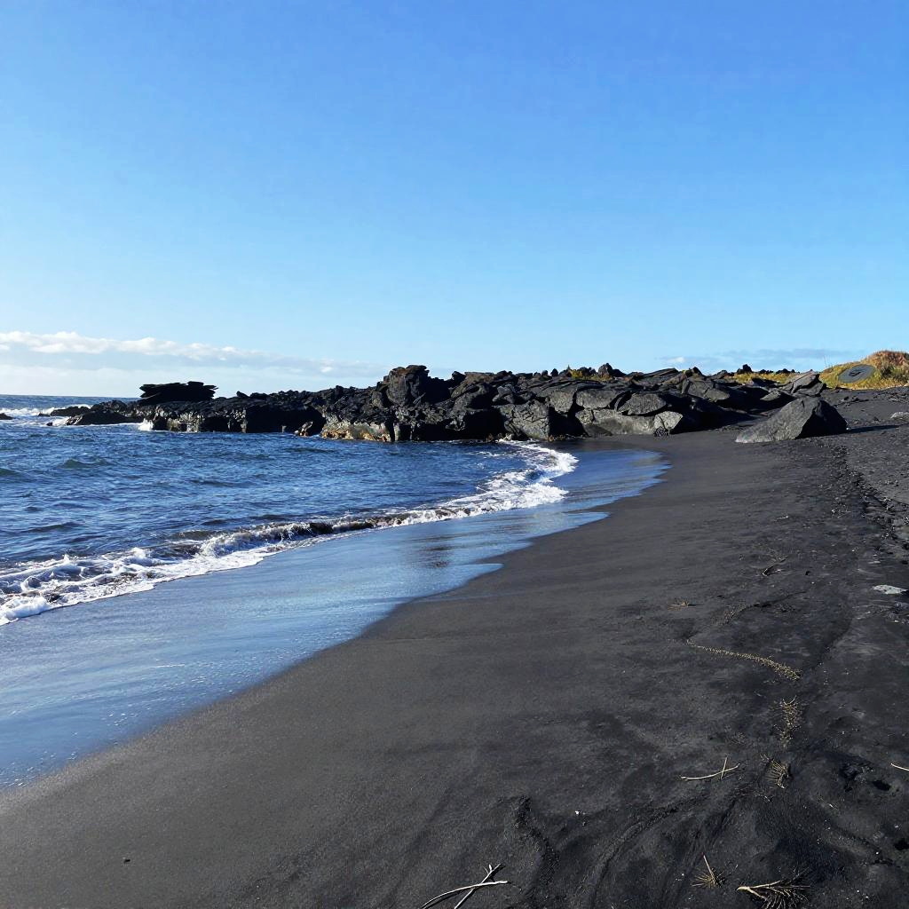 Black Sand Beaches, lava spires, crisp clear skies, midday, Surrealistic – dreamlike and exaggerated forms