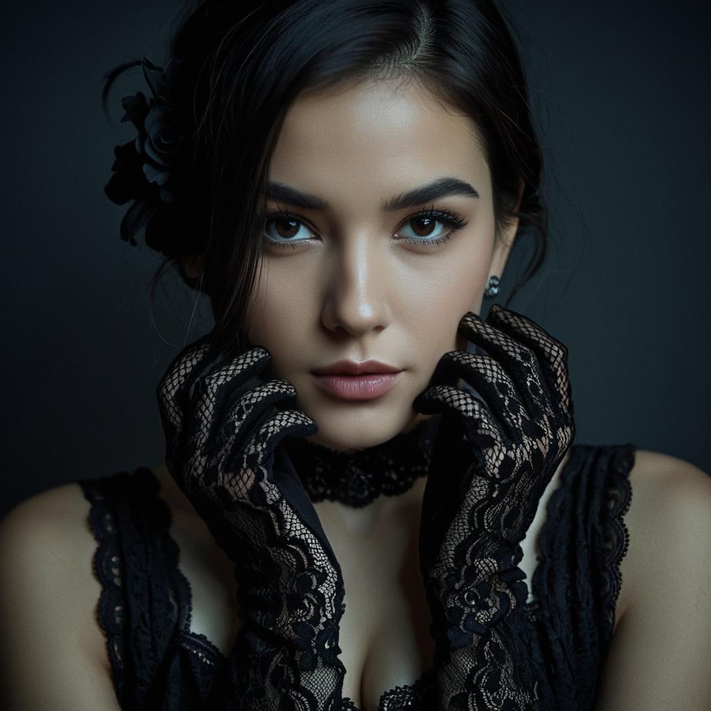 Close-up portrait of a young woman with dark hair styled loosely. She is wearing delicate black lace gloves and a matching lace choker. Soft, moody lighting highlights her facial features and smooth skin texture against a dark, unobtrusive background. The image features a muted color scheme with blacks, greys, and subtle warm skin tones, capturing a realistic and detailed photographic style.