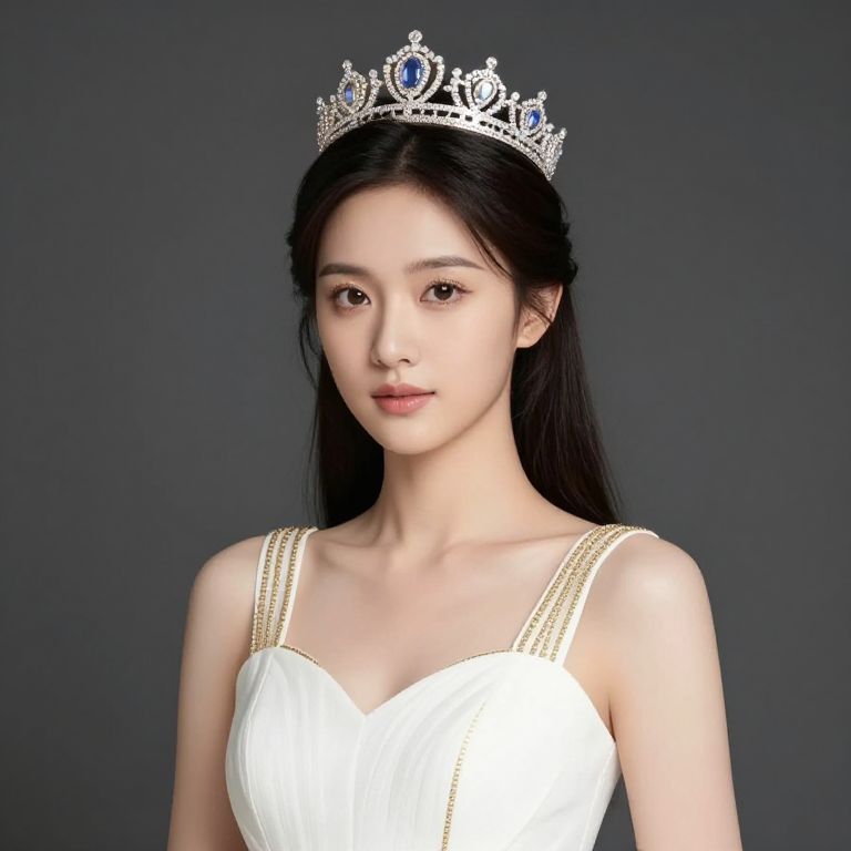 Photorealistic digital portrait of an Asian woman with long black hair, wearing a silver tiara, white dress with gold trim, and pearl earrings,