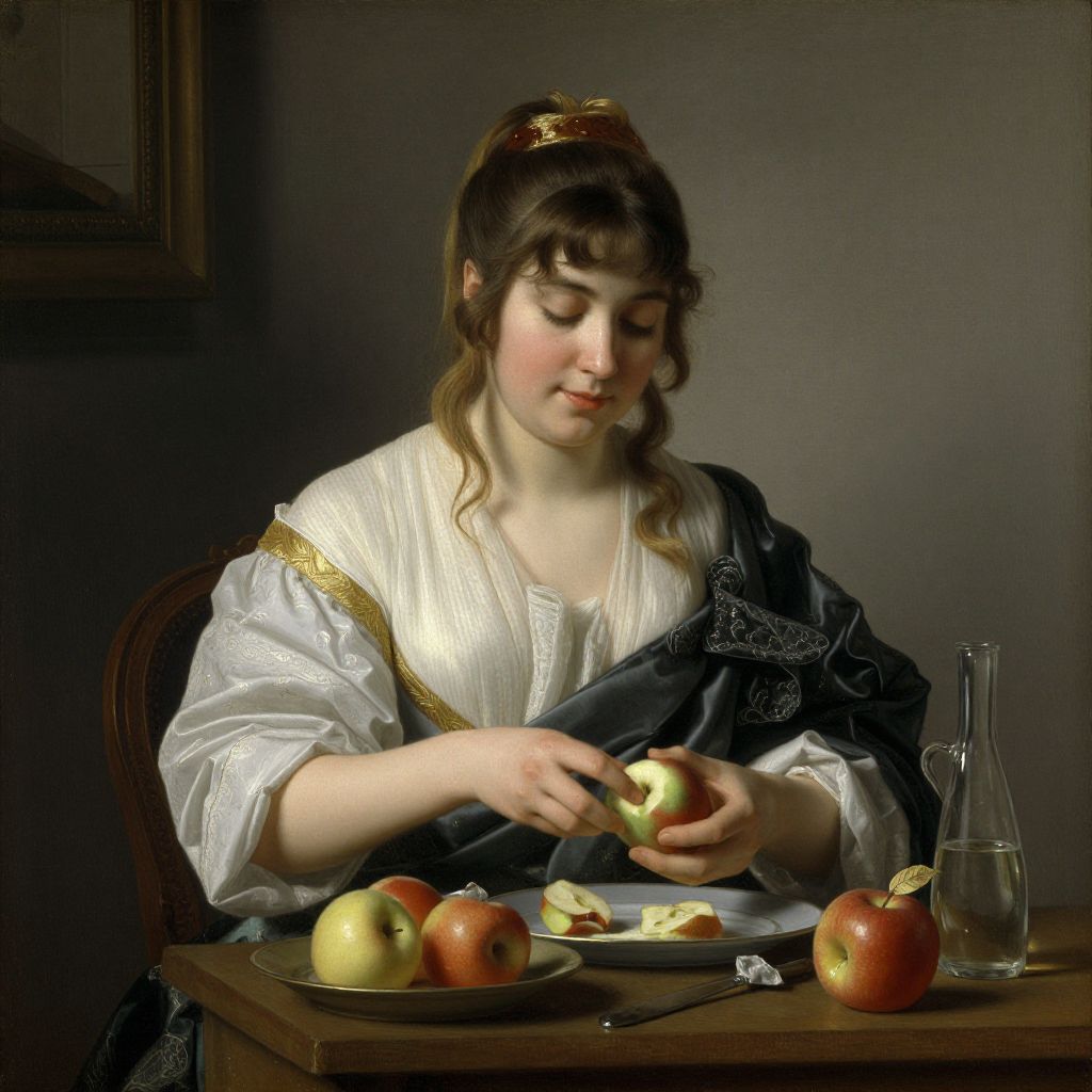 A classical oil painting by Gabriel Metsu, showcasing a woman in a serene indoor setting, delicately peeling an apple with soft, natural lighting accentuating her elegant attire and the rich textures of the fruit and tableware.