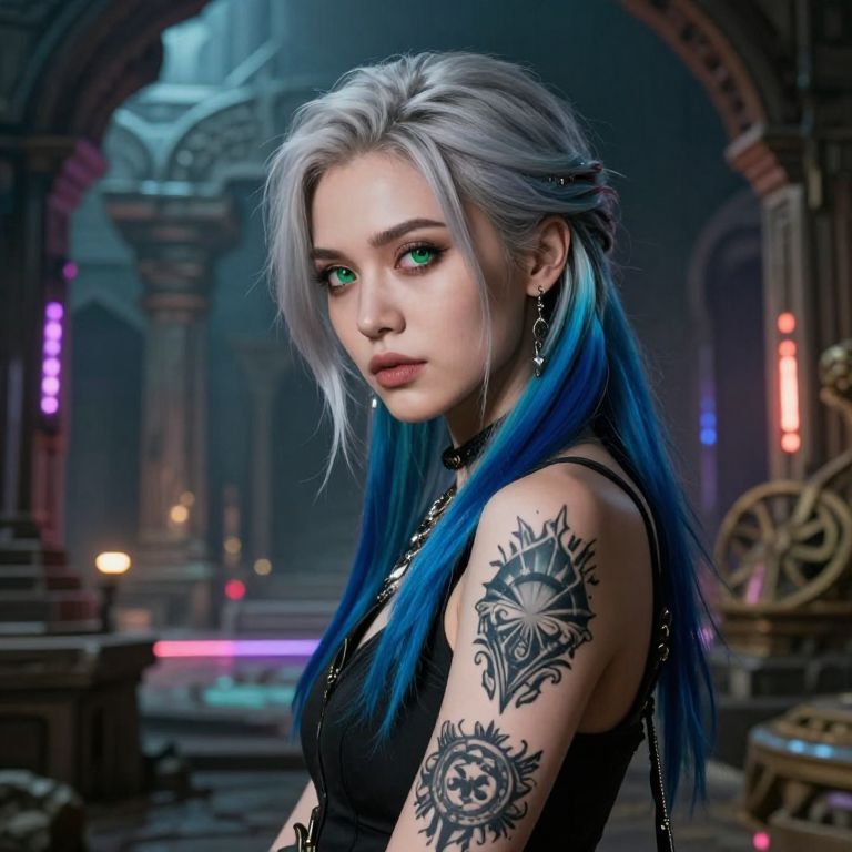 Imagine a DSLR portrait of a cryptic time traveler with warm green eyes and short silver hair streaked with vibrant blue highlights. Their arms are adorned with intricate tattoos. The surreal backdrop seamlessly blends past and future, featuring ancient ruins illuminated by futuristic neon lights. This three-quarter view perspective captures the subject's mysterious aura through subtle expressions, inviting viewers to explore their world of secrets and adventure.