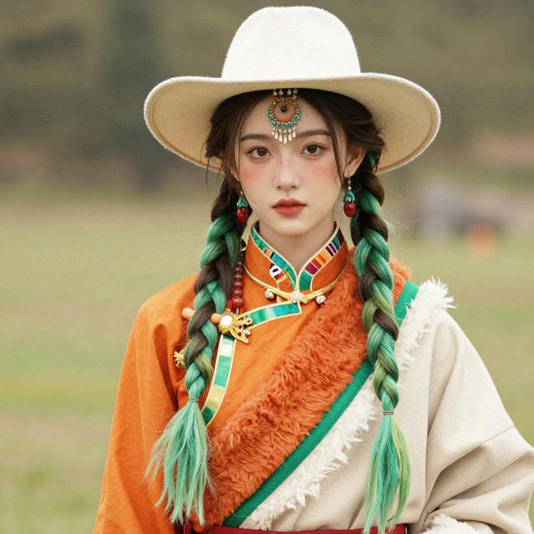 Female wearing a red and gold outfit with a hat on her head and accessories around her neck.
