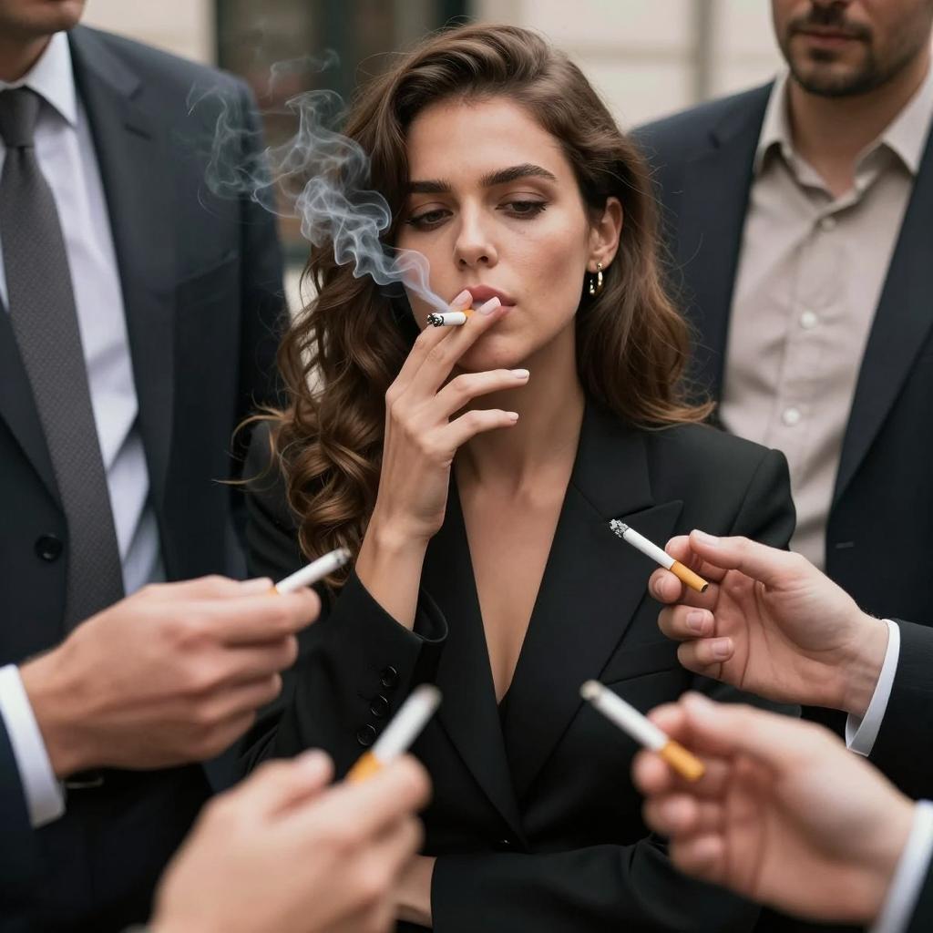Photograph of a woman with wavy brown hair, wearing a black blazer, smoking a cigarette. Multiple hands reach towards her, offering cigarettes. Background includes people in suits and a man in a beige shirt. Intense facial expression.