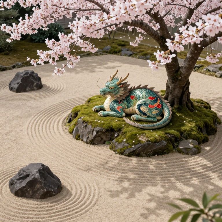 Envision an idyllic Japanese zen garden, inspired by Ukiyo-e woodblock print aesthetics, where a wise dragon takes respite on a moss-covered rock formation beneath the dappled shade of cherry blossom trees. The creature's scales display intricate patterns reminiscent of traditional koi fish and foliage, symbolizing the unity between nature and mythical beings. Captured from an aerial viewpoint, this image showcases the garden's precise arrangement of raked sand, strategically placed rocks, and delicate cherry blossoms dancing on the breeze, evoking a profound sense of peace and awe in this harmonious blend of fantasy with Japanese serenity.