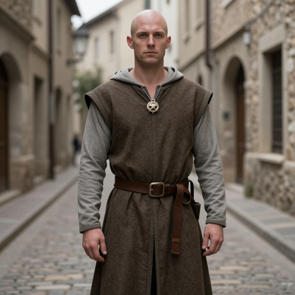 "Bald Character, man in medieval clothing standing in a narrow street"