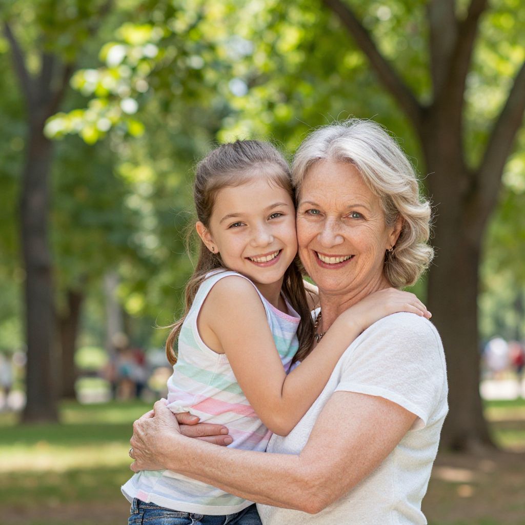 Grandmother and granddaughter share a joyful moment in a sunlit public park, with the older woman embracing the young girl as they both smile brightly against a backdrop of lush green trees and dappled sunlight.