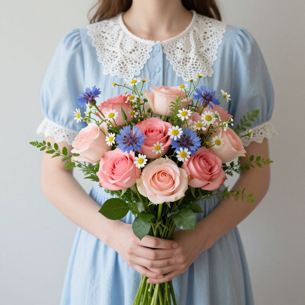 Woman in a serene portrait holds a vibrant bouquet of flowers, featuring pink roses, white daisies, blue cornflowers, and green foliage, while wearing a light blue dress with a delicate white lace collar and cuffs.
