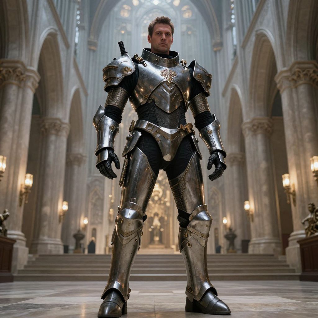 A formidable man clad in futuristic, full-body armored cyber-knight gear stands with confidence inside a grandiose underground cathedral, exuding a blend of medieval and sci-fi aesthetics.