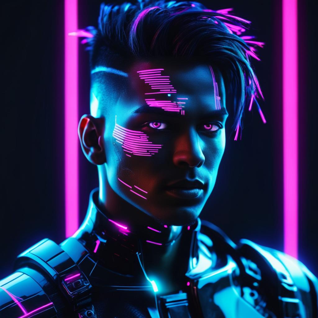Portrait of a man with glitch effect and neon light streaks across his face and body, cyberpunk aesthetic lighting, vibrant multicolor reflections and bright light contrasts, futuristic style, dark background